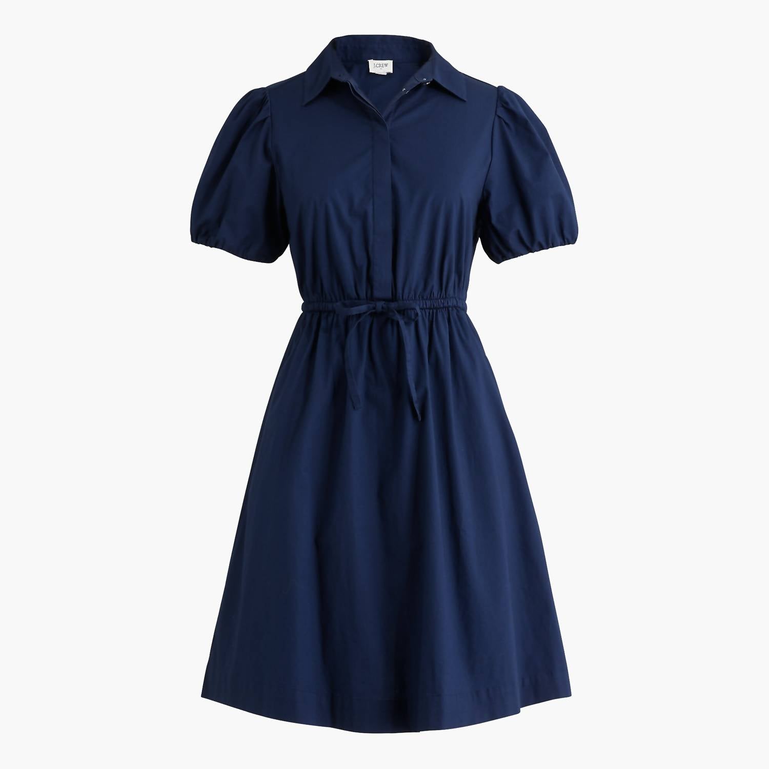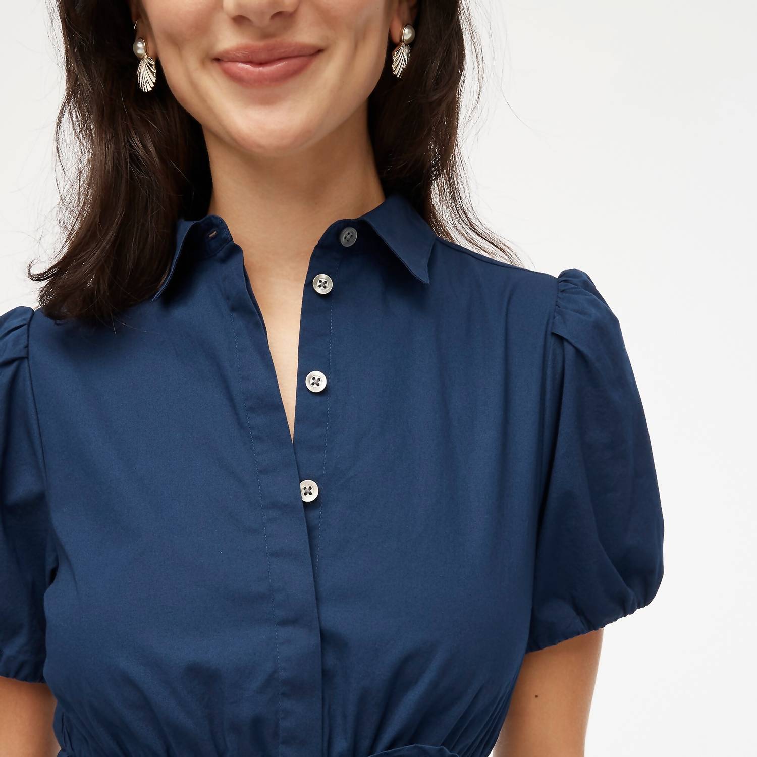 Meet the J.Crew Collared Short-sleeve Tie-waist Mini Dress in an elegant navy hue, perfect for adding a touch of sophistication to any wardrobe. Crafted from a cotton blend with 98% regenagri®-certified cotton and 2% elastane, this mini dress falls above the knee, measuring 36.75 inches from the high point of the shoulder. Its solid pattern and tie waist provide a flattering A-line silhouette, and it includes convenient pockets. Closure: Button closure. Origin: Made in India. Care: Machine wash and tumble dry.