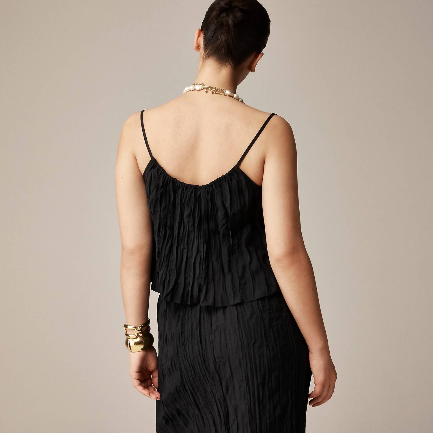 Fit, fabric and functionality. This tank top checks all the boxes. The Crinkled Tank Top by J.Crew offers a chic and practical solution for travel or beach days with its easy, off-the-body silhouette and pre-crinkled finish. Designed with spaghetti straps and featuring a composition of 85% viscose and 15% polyamide, this pull-on tank ensures comfort and style in one. Made in Cambodia, it has a body length of 22 inches and is highlighted by its solid black color. Care instructions: Dry clean only to maintain its unique crinkled texture.