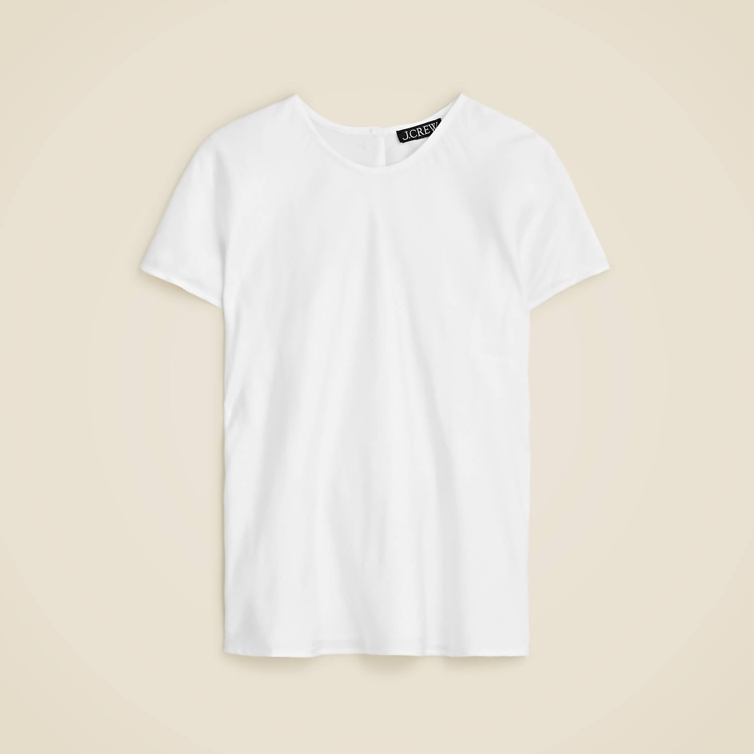This classic, short sleeve tee will be your go-to staple this season and beyond. Elevate your casual style with the Drapey T-shirt Top by J.Crew in elegant Ivory. This short sleeve tee is crafted from 100% viscose for a sleek and satiny finish, perfect for layering or wearing solo. Originating from India, it features a stylish back button closure and crewneck design. Garment length is 24 inches; for care, machine wash cold and line dry.