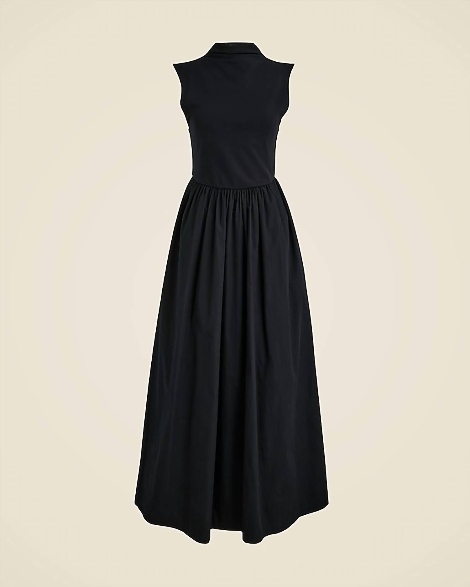 A midi dress so versatile, your options for wearing it are endless. Discover the Fitted Knit Mockneck Dress With Poplin Skirt by J.Crew, an elegant choice for versatile styling. This sleeveless midi dress falls 52 inches from the high point of the shoulder, combining a stretch cotton bodice with a crisp cotton poplin skirt. Made from 92% cotton and 8% elastane, it features a solid black pattern and a side zipper closure for easy wear. Care is effortless with a machine wash; this dress includes practical pockets and an A-line silhouette for added charm.