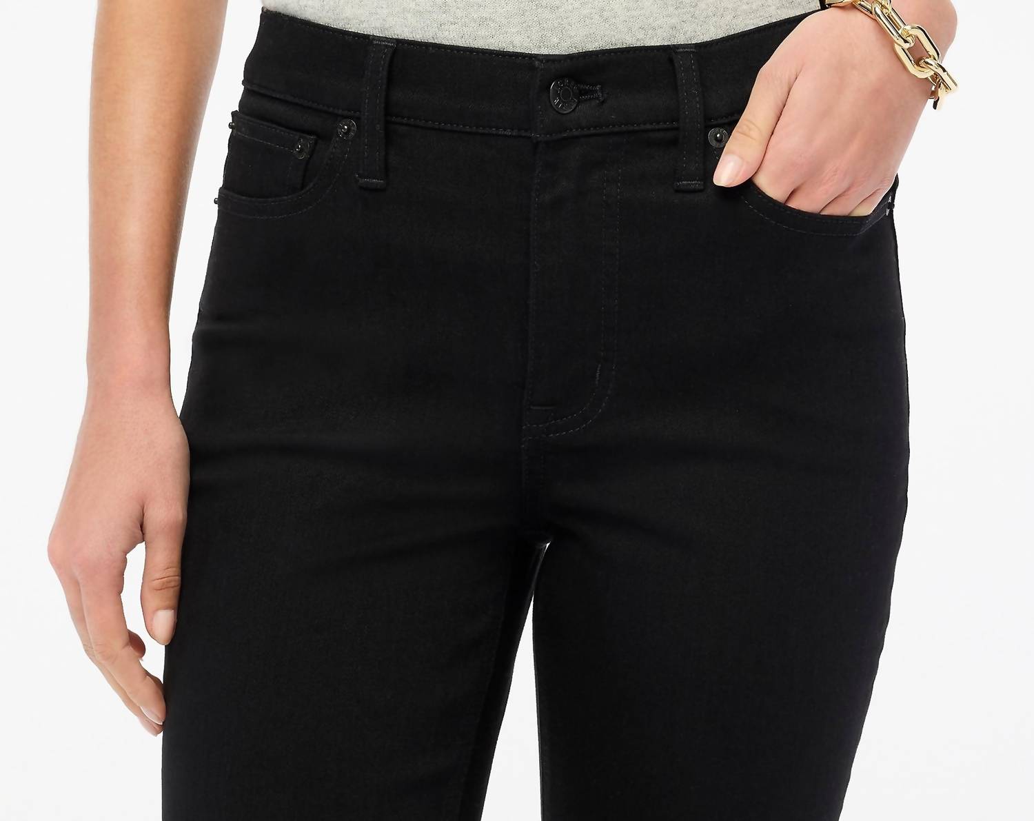 We especially love this cropped jean with a cute pair of slides or sandals. Experience the perfect blend of style and comfort with J.Crew's Flare Crop Black Jean, designed specifically in petite sizing. These jeans feature a high-rise, slim fit at the hip and thigh, with a cropped flared leg that sits below the waist. Crafted from 76% cotton, 22% polyester, and 2% elastane, the denim provides all-day stretch for an easy, flexible feel. The traditional 5-pocket styling is paired with a convenient zip closure, and the jeans are machine washable and tumble dry safe. Inseam: 24".