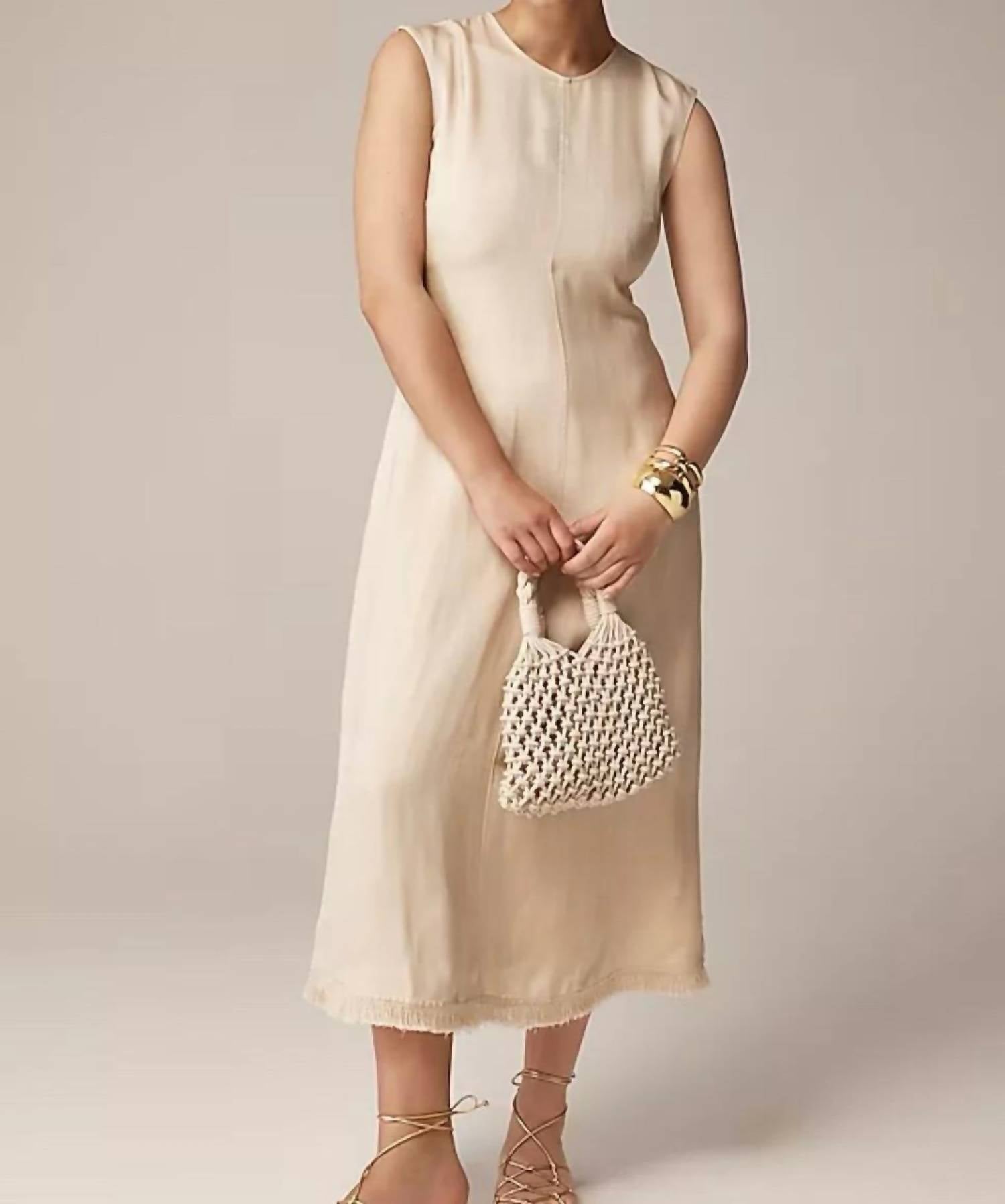 The perfect length dress does exist. Discover the Fringe-trim Dress in Glossy Twill by J.Crew, a stylish piece in a warm platinum hue. Featuring sleeveless design, it boasts a composed 100% viscose material that falls to an elegant 50.5 inches, just above the ankle. Made in Indonesia, this dress is completed with zip closure and is easy to maintain with dry cleaning. The dress's textured twill fabric adds a touch of sheen, accented with a subtle fringe for casual flair.