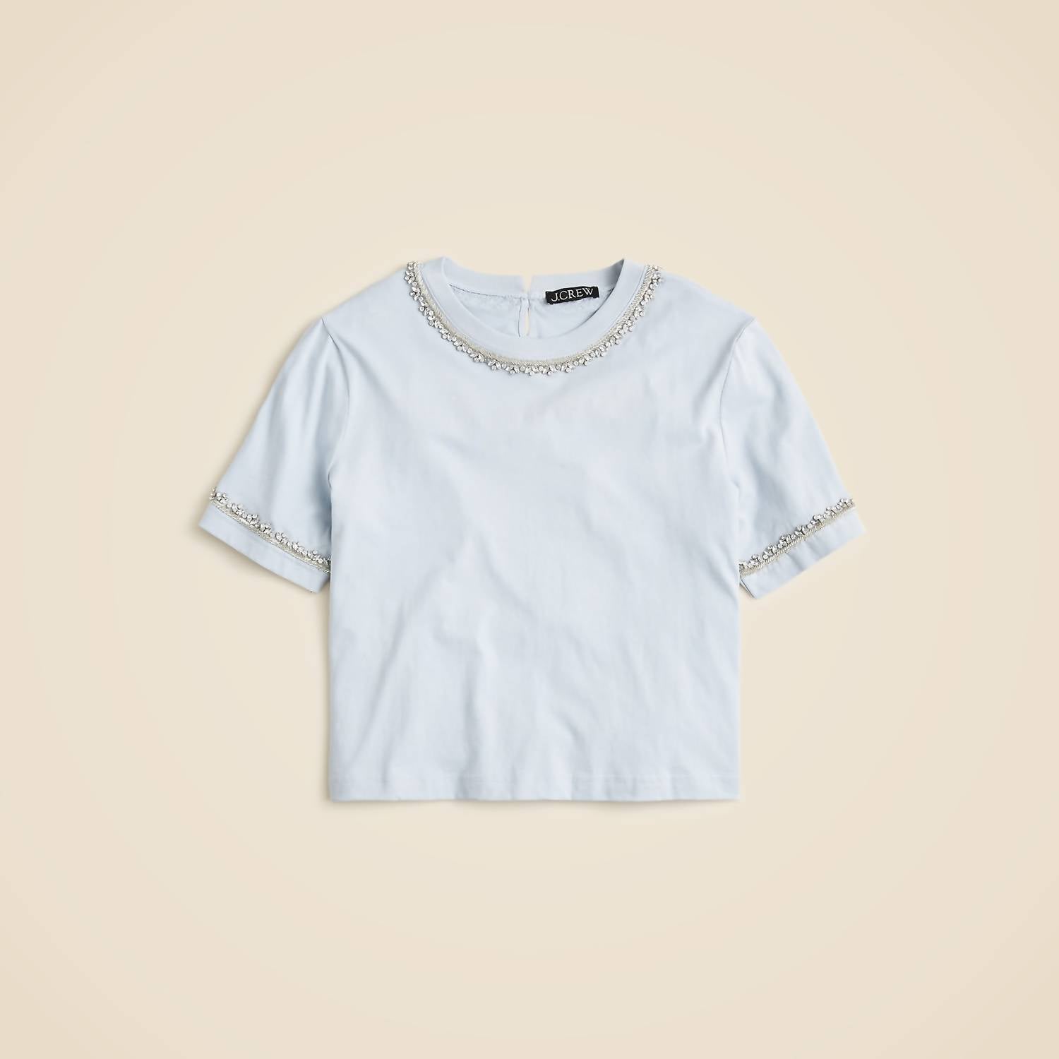 Introducing the Heavy Jersey T-shirt With Rhinestones by J.Crew, a chic addition to any wardrobe. With its short sleeves and crafted from 100% cotton, this piece offers a smooth handfeel and features small crystal embellishments with a silver trim at the collar and cuffs. Made in India, it offers a convenient back button closure and measures 22 inches in body length. For easy maintenance, this blue tee is machine washable and can be tumble dried.