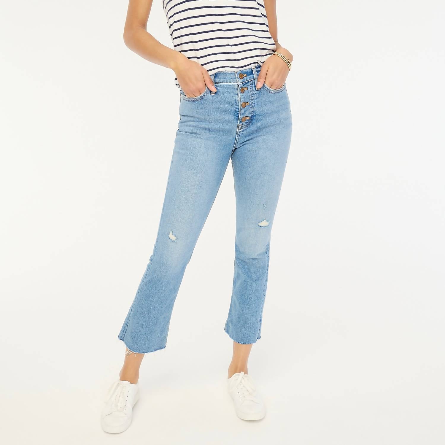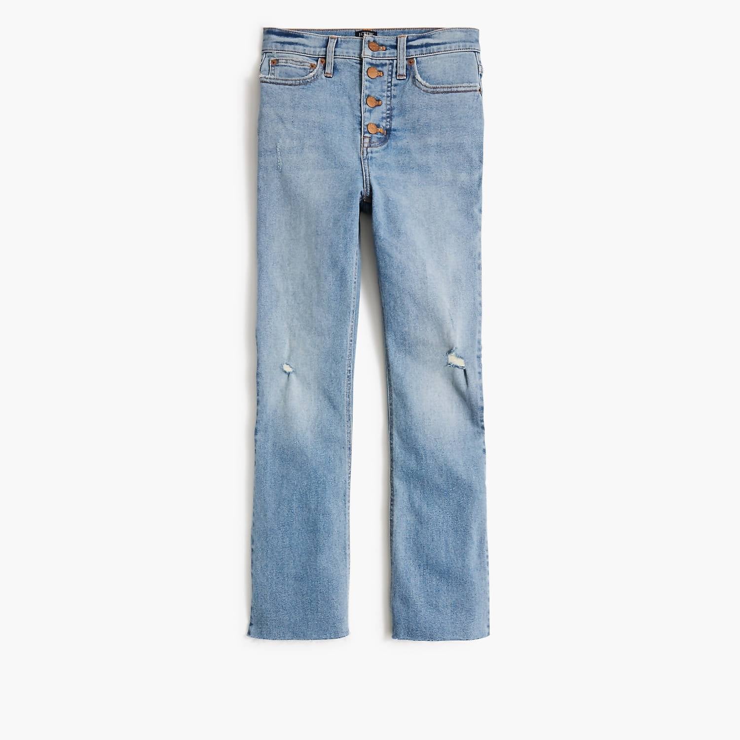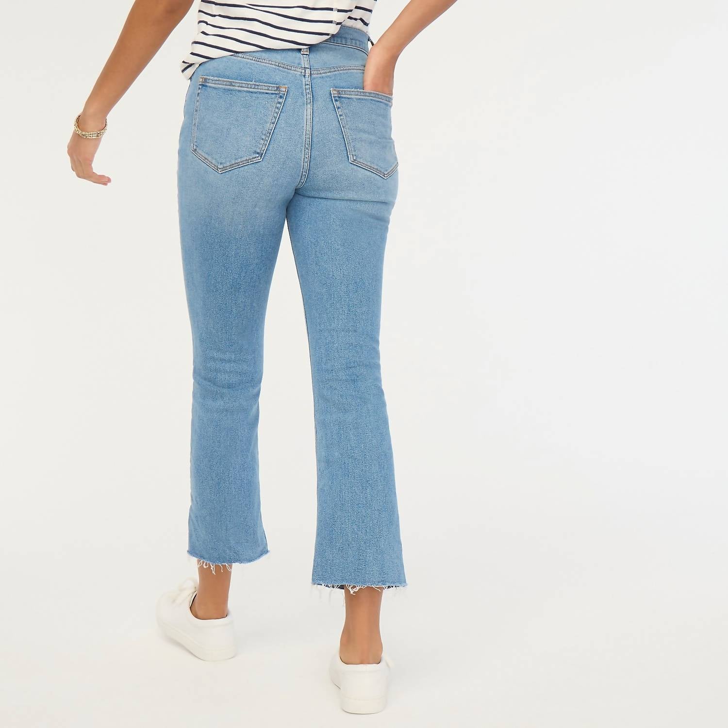Tuck your favorite tee into these high-waist jeans for a more casual-cool feel. Discover the High-rise Flare Crop Jean by J.Crew, expertly crafted for those with an appreciation for versatility and style. Featuring a comfortable composition of 92% cotton, 7% recycled cotton, and 1% elastane, these jeans offer an all-day stretch with minimal stretch for easy wear. Fashioned with a button closure and traditional 5-pocket styling, these jeans sit above the waist with a slim fit through the hip and thigh, ending in a chic, flared cropped leg with a classic 26" inseam. Originating from Cambodia, care is maintained with machine wash and tumble dry instructions.
