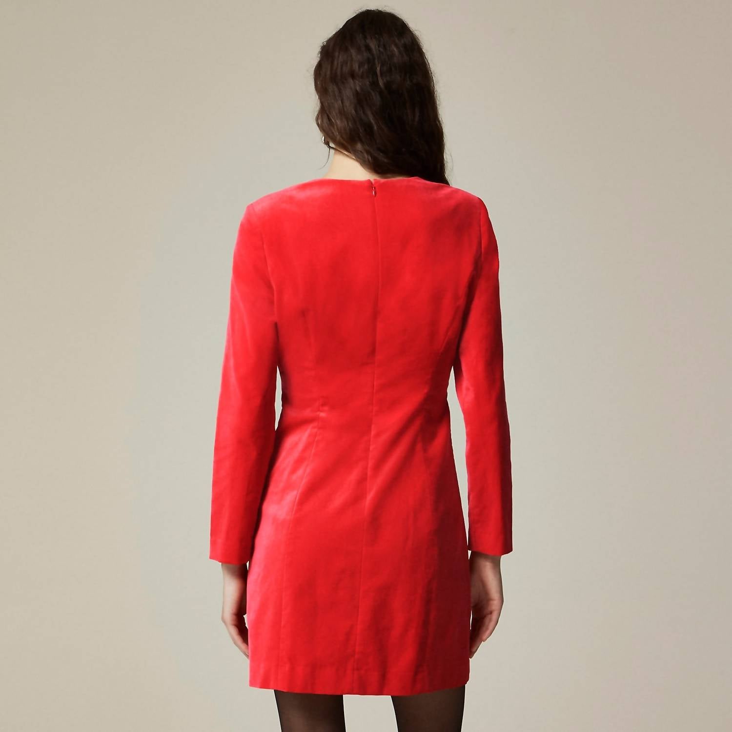 The kind of easy and flattering dress you'll be reaching for all season long. Elevate your wardrobe with the Long-sleeve Shift Dress by J.Crew, designed for a chic, sophisticated look in stunning red. This sheath silhouette dress is crafted from a luxurious blend of 76% cotton, 22% lyocell, and 2% elastane velvet, ensuring it moves gracefully with you. It features long sleeves and a secure back zip closure, and falls elegantly above the knee with a length of 34.5 inches from the shoulder. For easy care, simply machine wash this timeless piece.