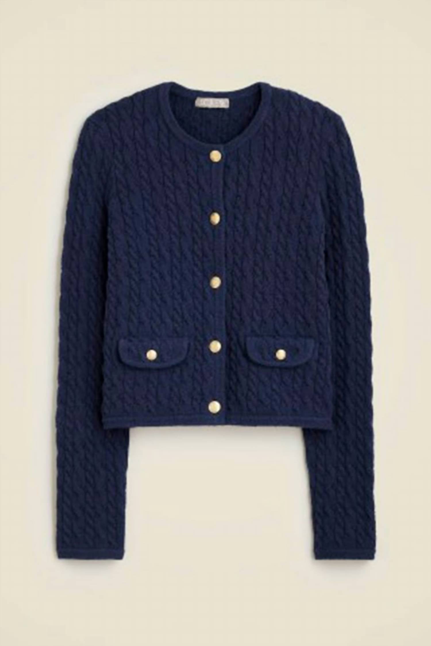 Throw this adorable cardigan over any cami or tank top. Introducing the Odette Cable-knit Sweater Lady Jacket by J.Crew, a stylish blend of a jacket and cardigan in timeless navy. This cozy long sleeve piece is crafted from a 68% cotton, 31% polyamide, and 1% elastane blend, featuring a luxurious textured finish. The garment originates from China and boasts a button closure, with thoughtful details like gold crest buttons and flap pockets. Designed with a cropped fit, it measures 19.5" in length and requires dry cleaning for optimal care.