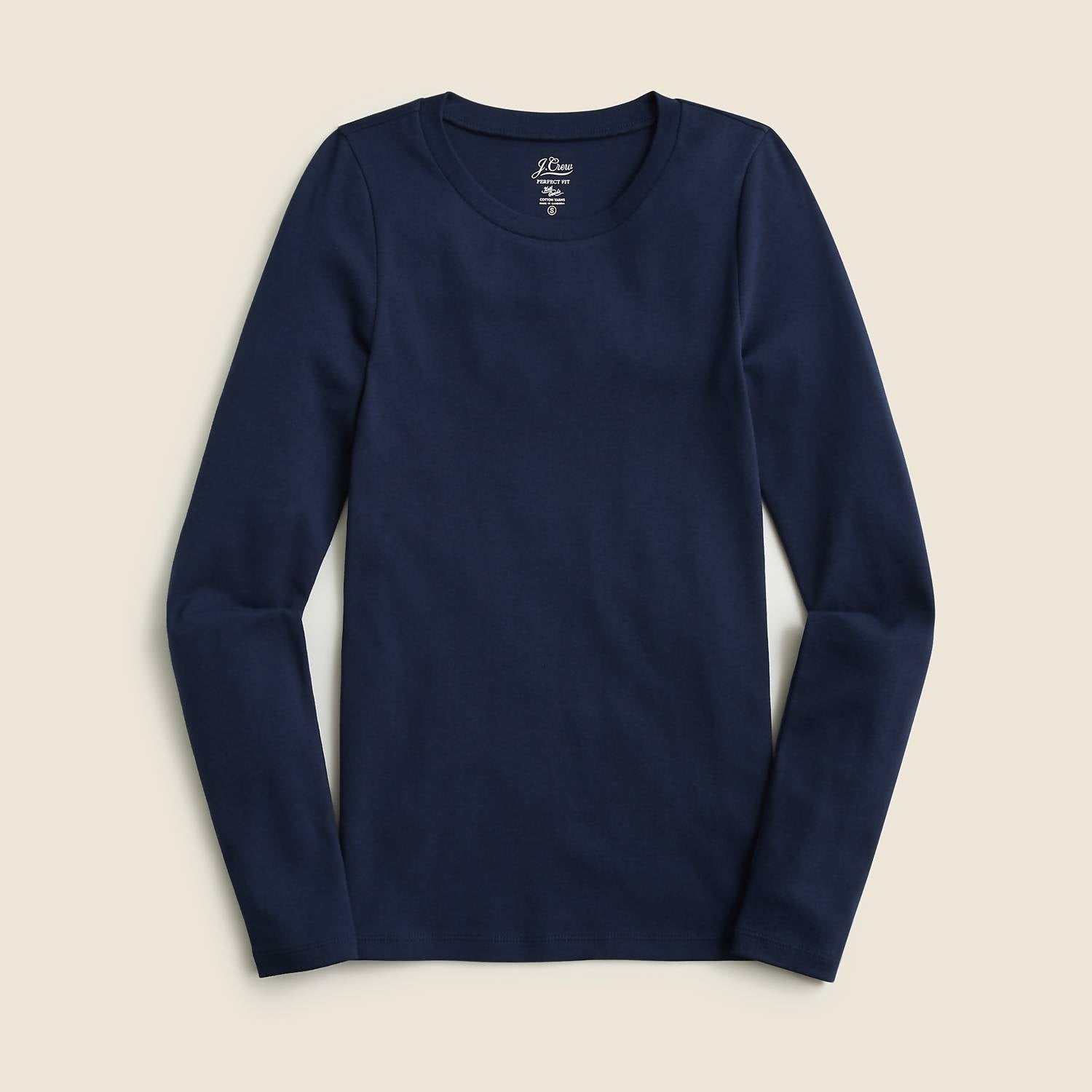 Great fit, cute design, soft fabric. You'll love everything about this long sleeve tee. Discover the Perfect-fit Long-sleeve Crewneck T-shirt by J.Crew, a classic navy essential for any wardrobe. This solid pattern tee boasts long sleeves and is crafted from 100% cotton for superior comfort. With a pull-on design, it measures a body length of 25.5 inches and is made in Cambodia. Easy to care for, simply machine wash and tumble dry.