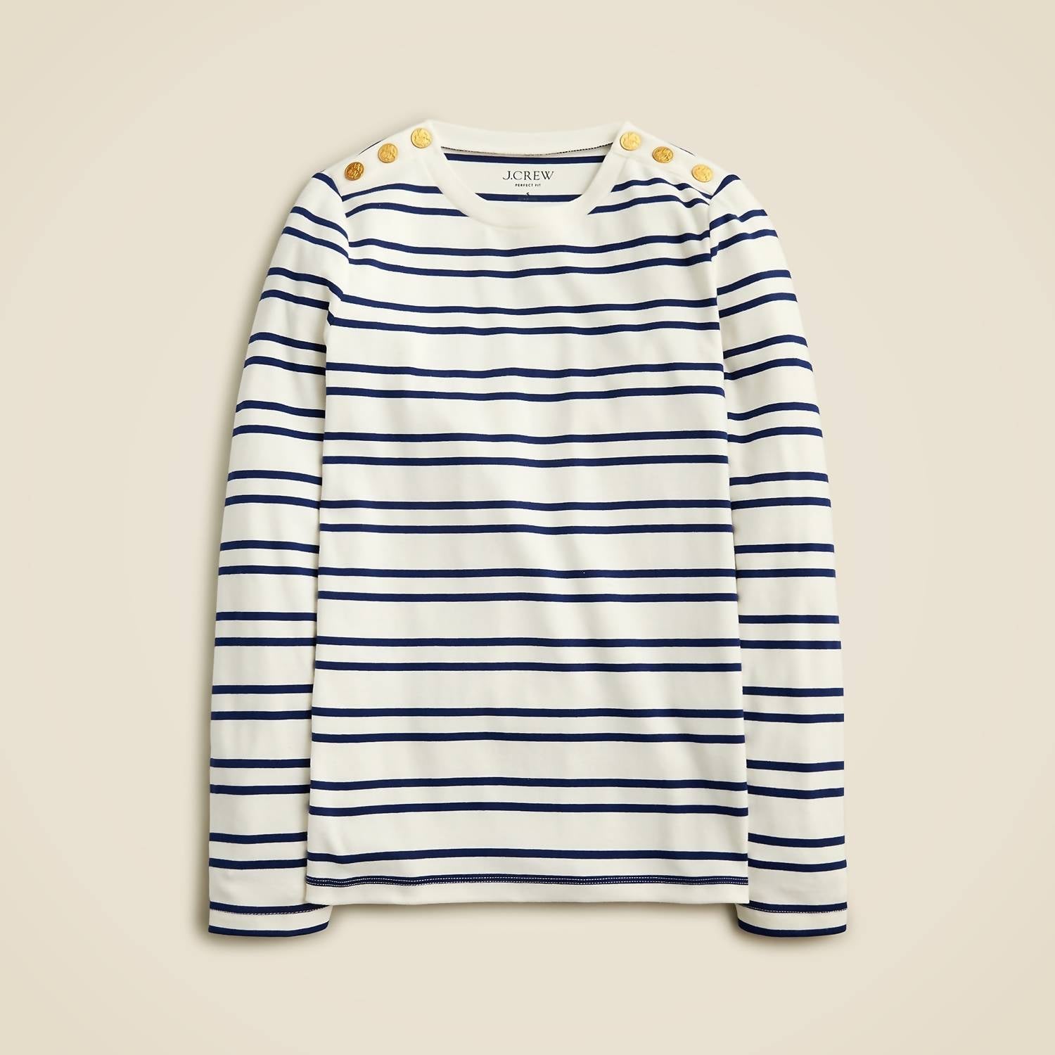 The perfect long sleeve tee that goes with just about anything. Meet the J.Crew Perfect-fit Long-sleeve Crewneck T-shirt With Lion Buttons Stripe, a stylish staple in Sporty Rib Stripe Ivory. Crafted from 100% cotton, this tee showcases long sleeves and a striking crewneck design, adorned with gold buttons engraved with lions along the shoulders for a polished touch. Length: 25.5 inches. Country of origin: Cambodia. Care: Machine wash, tumble dry. Closure: Pull on.