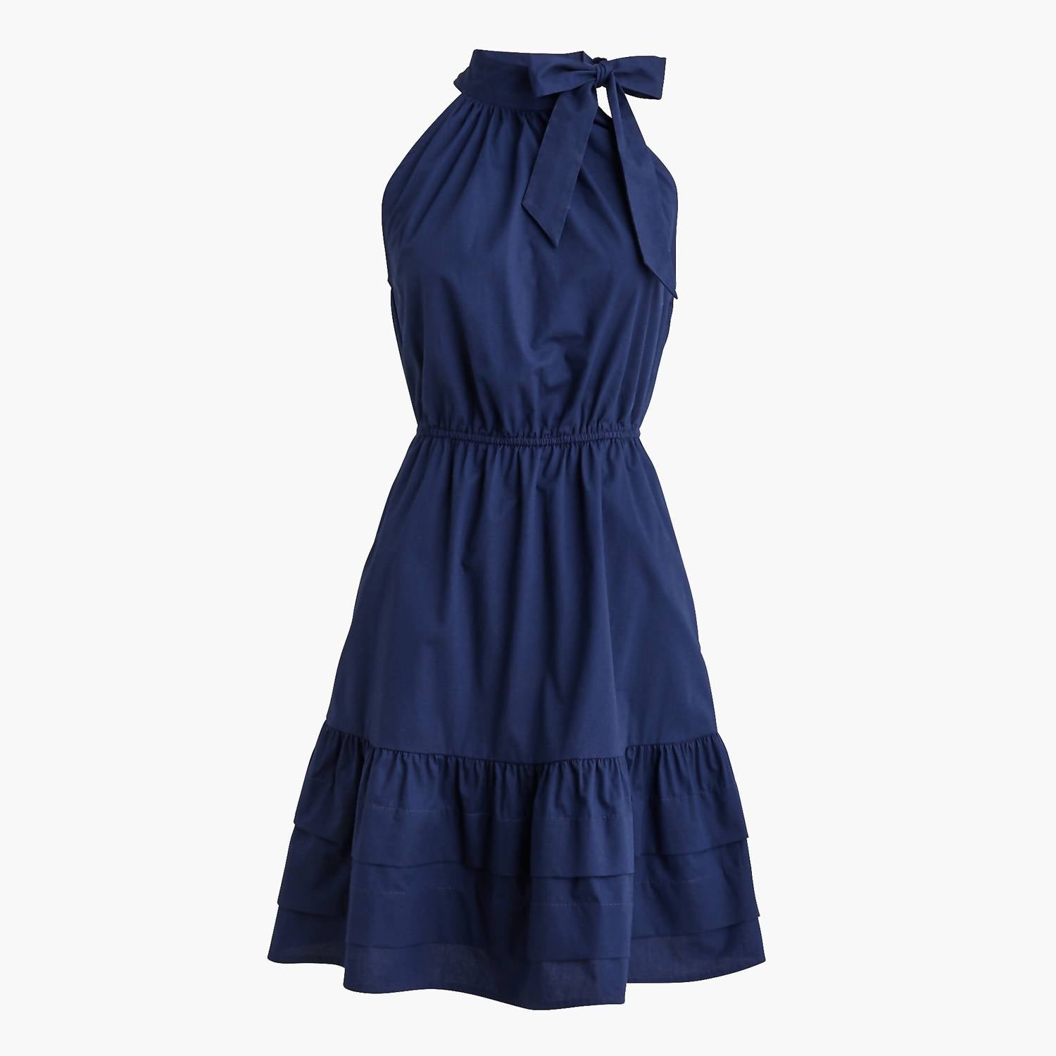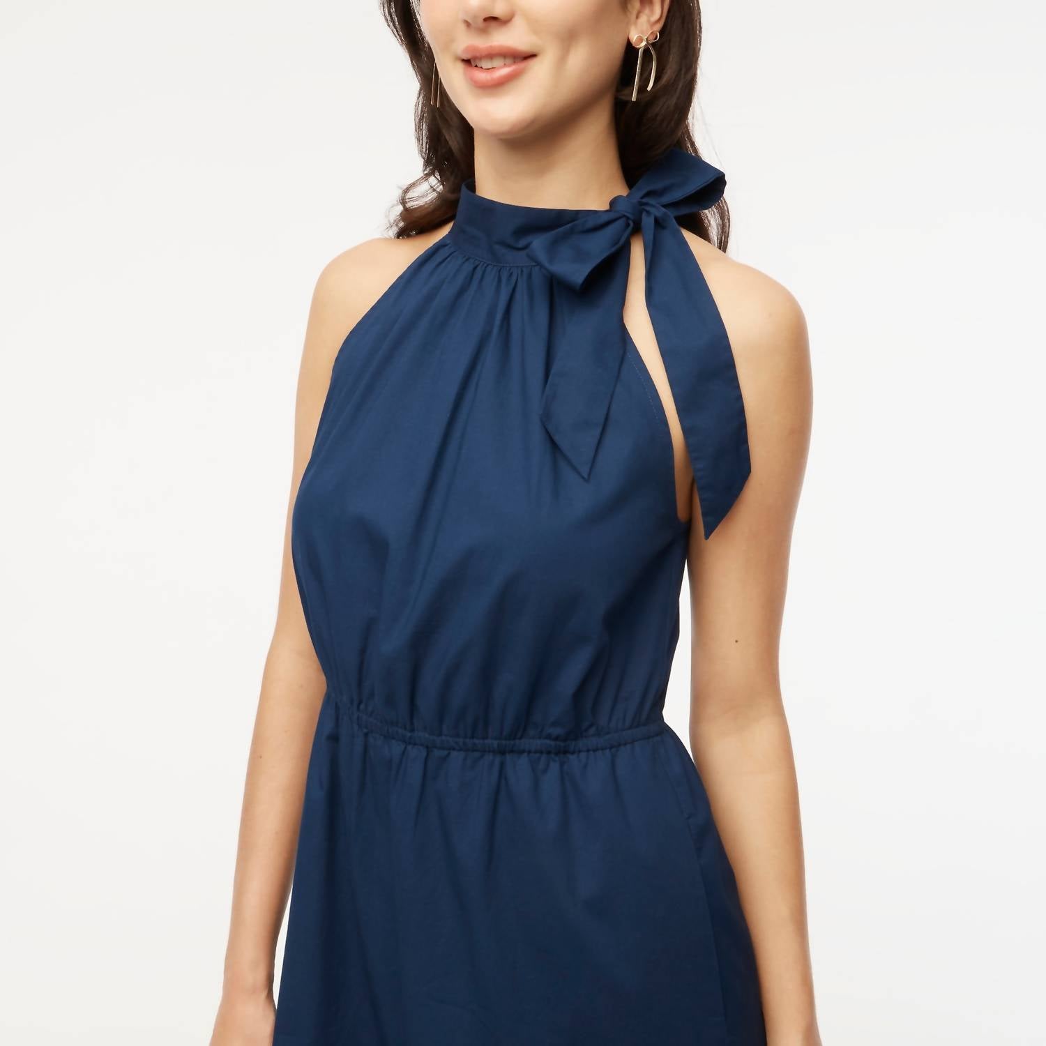 The kind of easy and flattering dress you'll be reaching for all season long. Embrace timeless elegance with the J.Crew Poplin Halter-neck Mini Dress, a chic addition to your wardrobe in a solid blue hue. This sleeveless dress is crafted from a cotton blend, consisting of 98% cotton and 2% elastane, offering a comfortable and flattering fit. With a modern A-line silhouette and a length of 36.5 inches, it gracefully falls above the knee. Manufactured in India, the dress features convenient pockets, and is easy to care for with machine wash and tumble dry instructions.