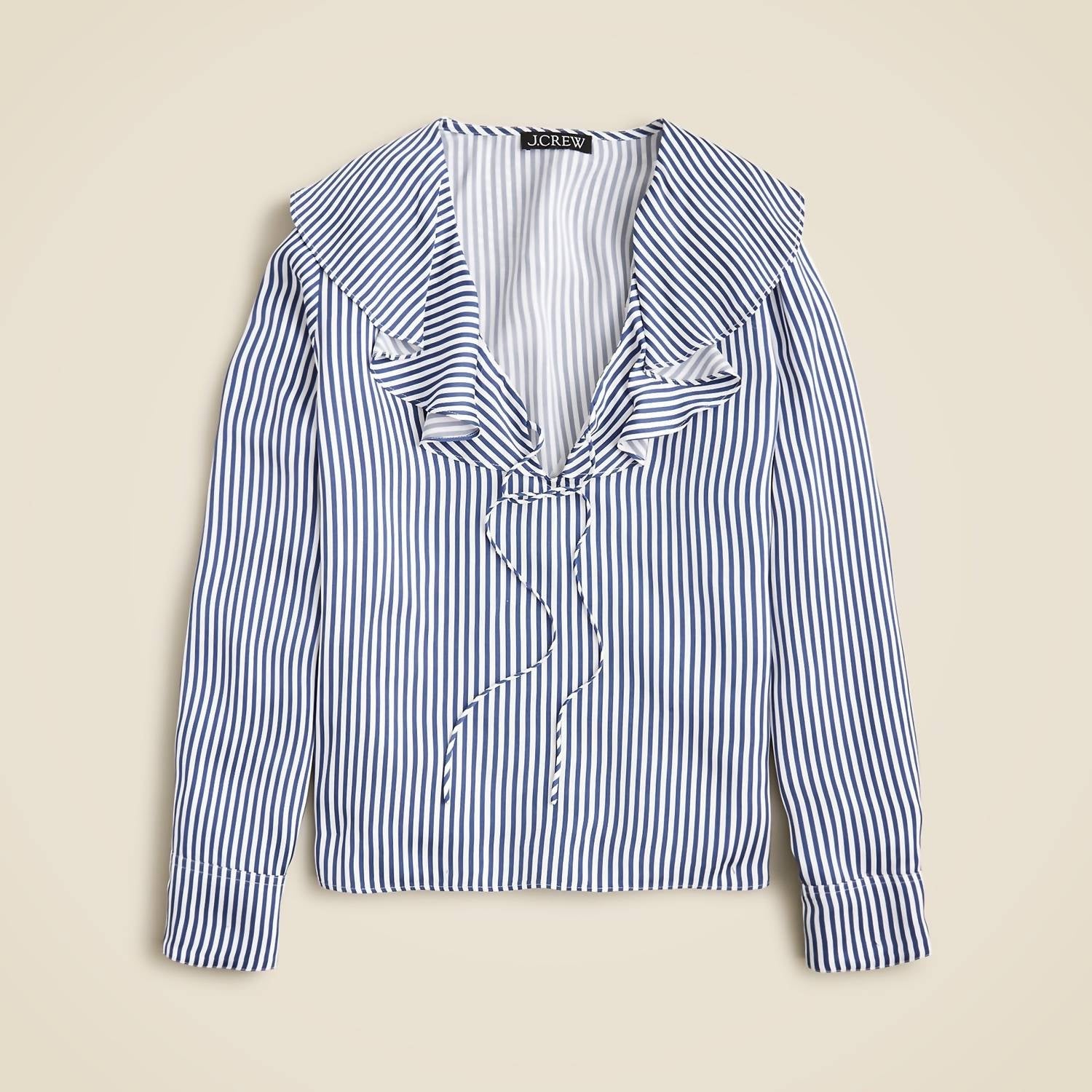 A versatile blouse that works from desk to dinner! Elevate your wardrobe with the J.Crew Women's Goldie Top in Striped Satin, featuring elegant long sleeves and a stylish V-neck. Crafted from 100% viscose, this blouse offers a luxurious satin finish and a timeless blue/white stripe pattern. With a garment length of 24 inches, the top is pull-on and originates from India. For easy maintenance, machine wash cold and line dry.