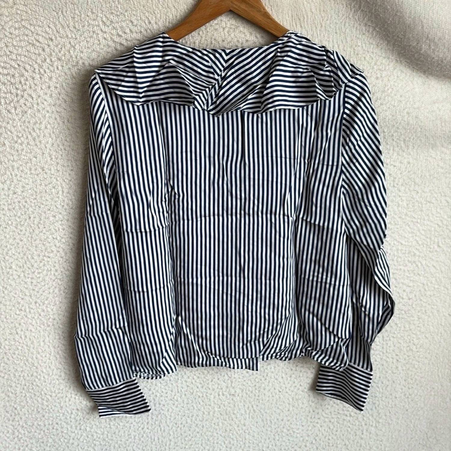 Elevate your wardrobe with the J.Crew Women's Goldie Top in Striped Satin, featuring elegant long sleeves and a stylish V-neck. Crafted from 100% viscose, this blouse offers a luxurious satin finish and a timeless blue/white stripe pattern. With a garment length of 24 inches, the top is pull-on and originates from India. For easy maintenance, machine wash cold and line dry.