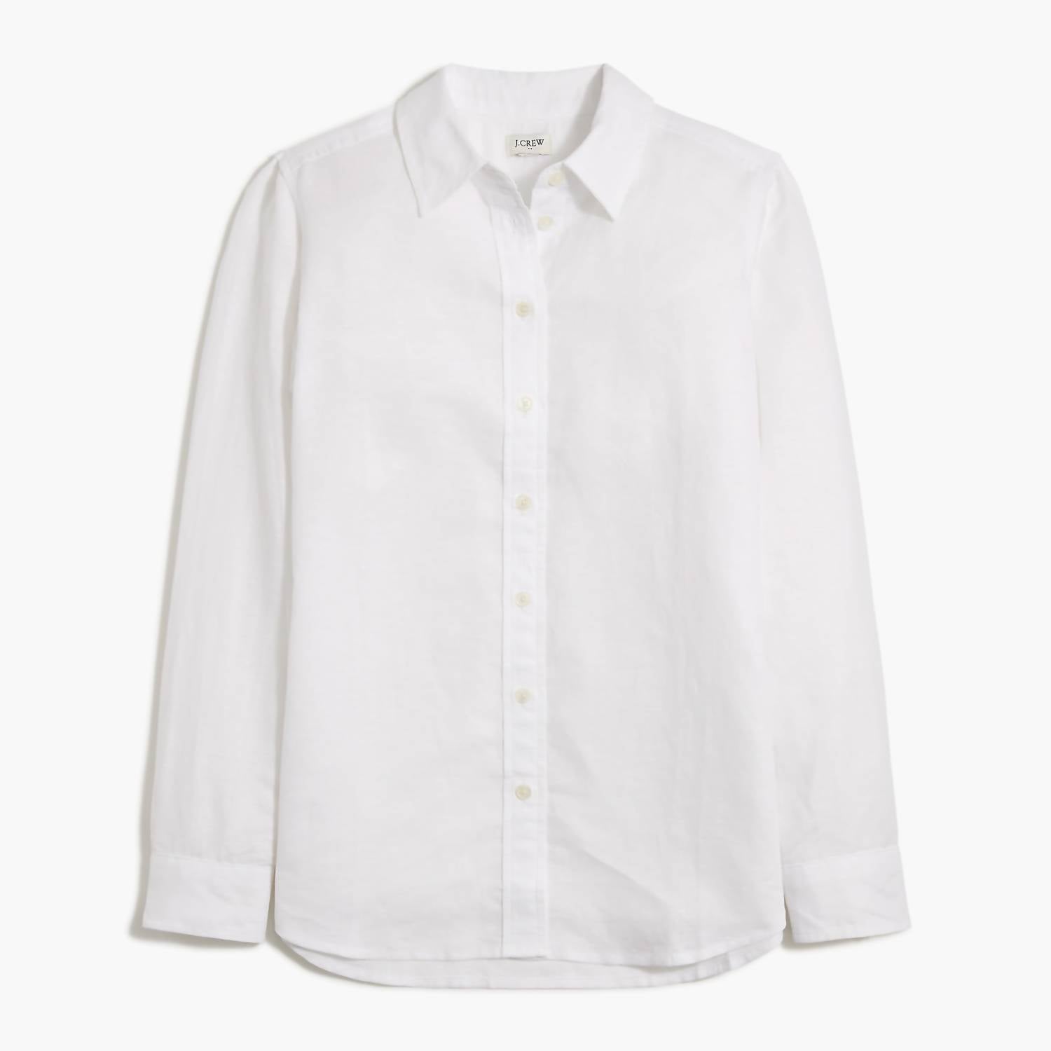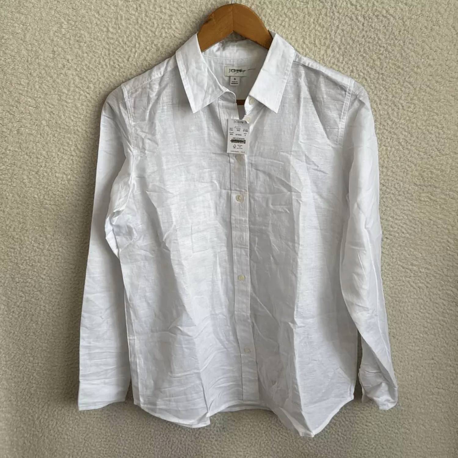 This button down shirt is comfortable yet polished. Discover the Women's Linen-blend Button-up Shirt by J.Crew, an elegant staple for a chic wardrobe. This shirt, crafted from a blend of 60% linen and 40% cotton, offers the perfect balance of comfort and style with its long sleeves and solid white color. Originating from Indonesia, it features a classic collar and a button closure for a timeless look. Care instructions include machine washing and tumble drying for easy maintenance.