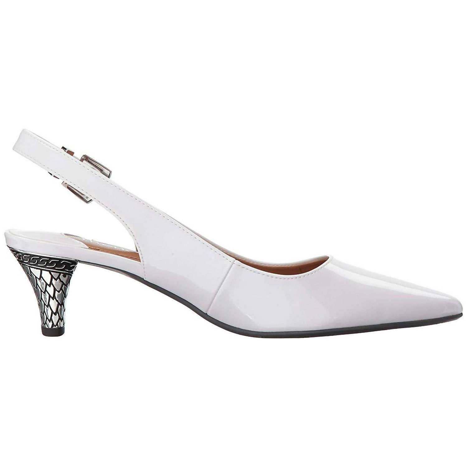 Pair these beauties with your favorite skinny jeans or dress for a night out on the town. Step into elegance with the Women's Mayetta Pump by J. Renee, crafted in chic White Pearl faux-patent leather. Designed with a pointed toe, this sophisticated heel features a slingback strap and an adjustable buckle closure for a tailored fit. Comfort is paramount with smooth synthetic linings and a memory foam footbed providing added padding at key points. The modest 2-inch sculpted cone heel offers a stylish finish, supported by a durable man-made outsole.