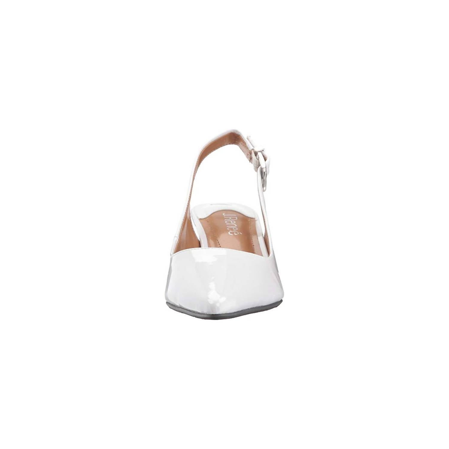 Step into elegance with the Women's Mayetta Pump by J. Renee, crafted in chic White Pearl faux-patent leather. Designed with a pointed toe, this sophisticated heel features a slingback strap and an adjustable buckle closure for a tailored fit. Comfort is paramount with smooth synthetic linings and a memory foam footbed providing added padding at key points. The modest 2-inch sculpted cone heel offers a stylish finish, supported by a durable man-made outsole.