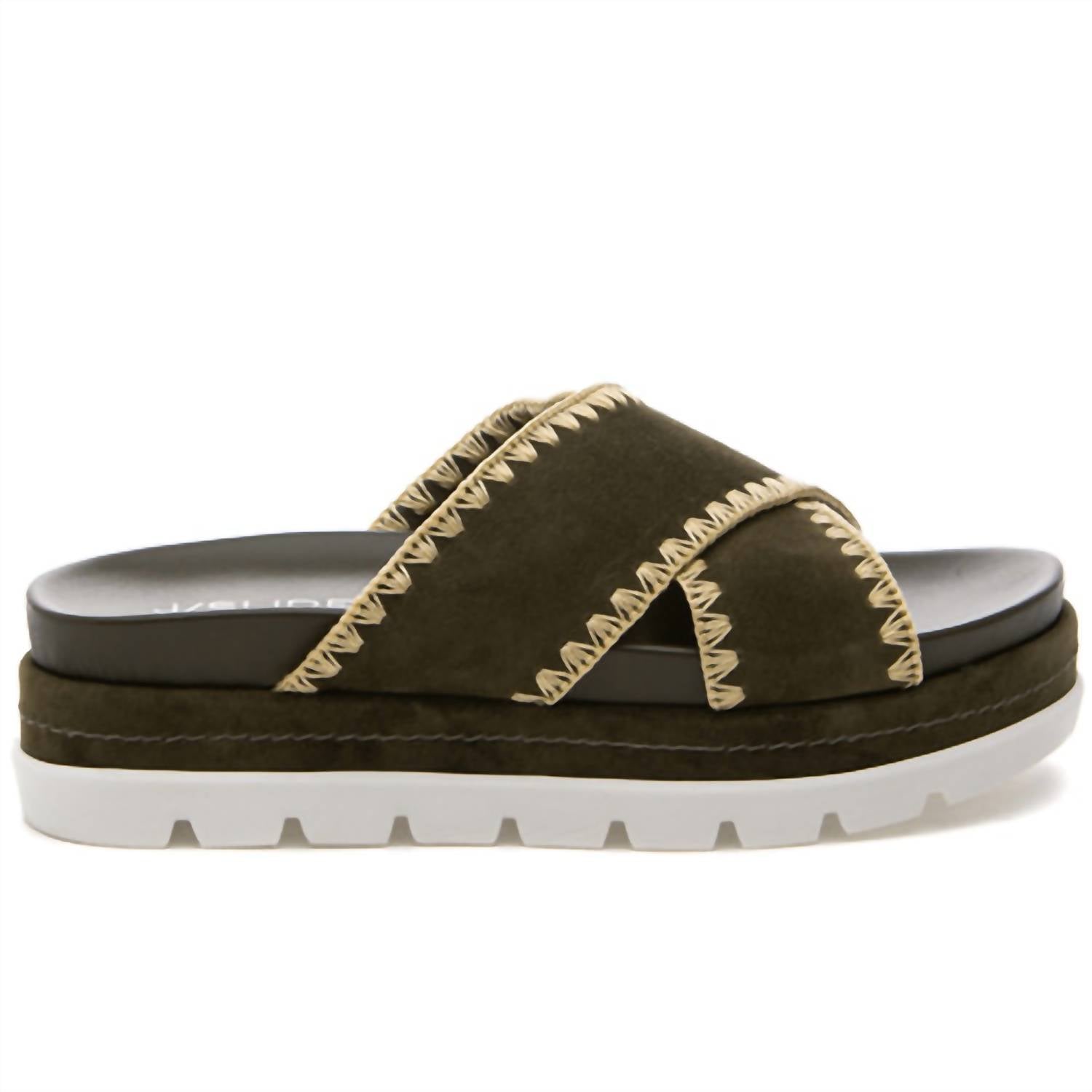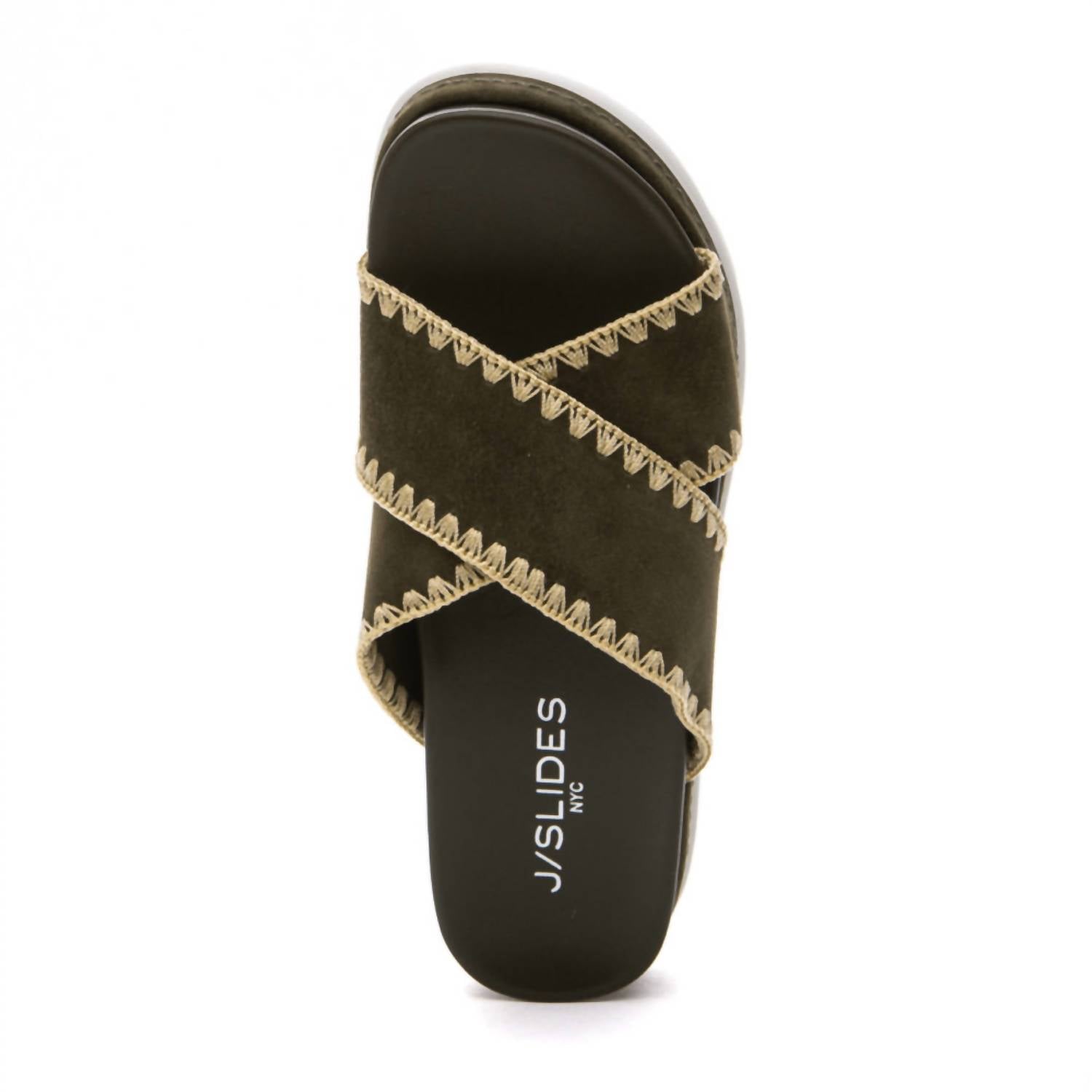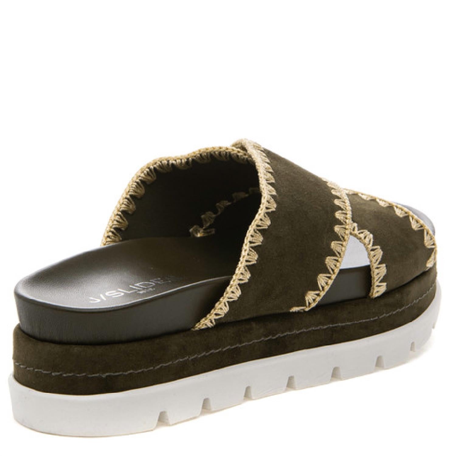 Classicly cute and all-day-wearable. We love this sandal. Step out in style with the Women's Boo Suede Sandal by J/SLIDES, a chic olive accessory perfect for any occasion. The sandal features a kid suede upper with intricate silk stitching and an open toe design. It is expertly crafted with a leather lining, cushioned insole, and a durable rubber sole, boasting a comfortable 1.5-inch platform wedge heel. This imported piece is true to size, offering both elegance and everyday comfort.
