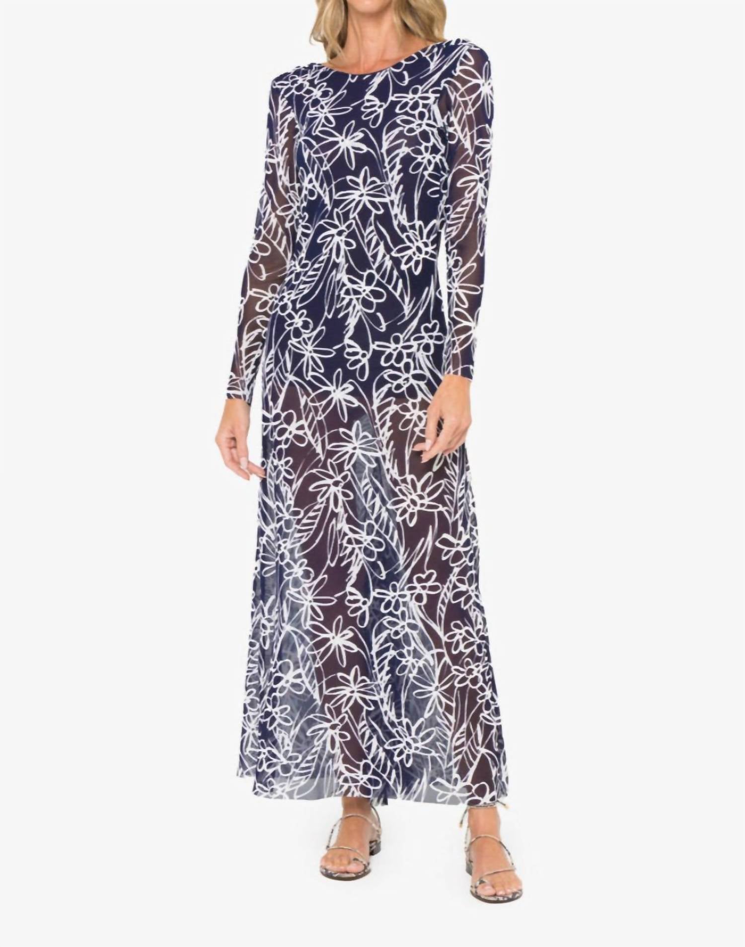 A maxi dress that is just as cute as it is comfortable. Introducing the Gaia Maxi Dress by JBQ, an elegant choice for evening events with its sophisticated boho-chic appeal. This dress features a crewneck, long fitted sleeves, and a striking open scooped back, all in a sheath silhouette that exudes relaxed charm. Crafted from a blend of 96% Polyester and 4% Spandex, it is presented in a bold navy-white floral pattern. Made in the USA, this dress offers a pull-on closure and requires hand washing and line drying to maintain its elegant appearance.