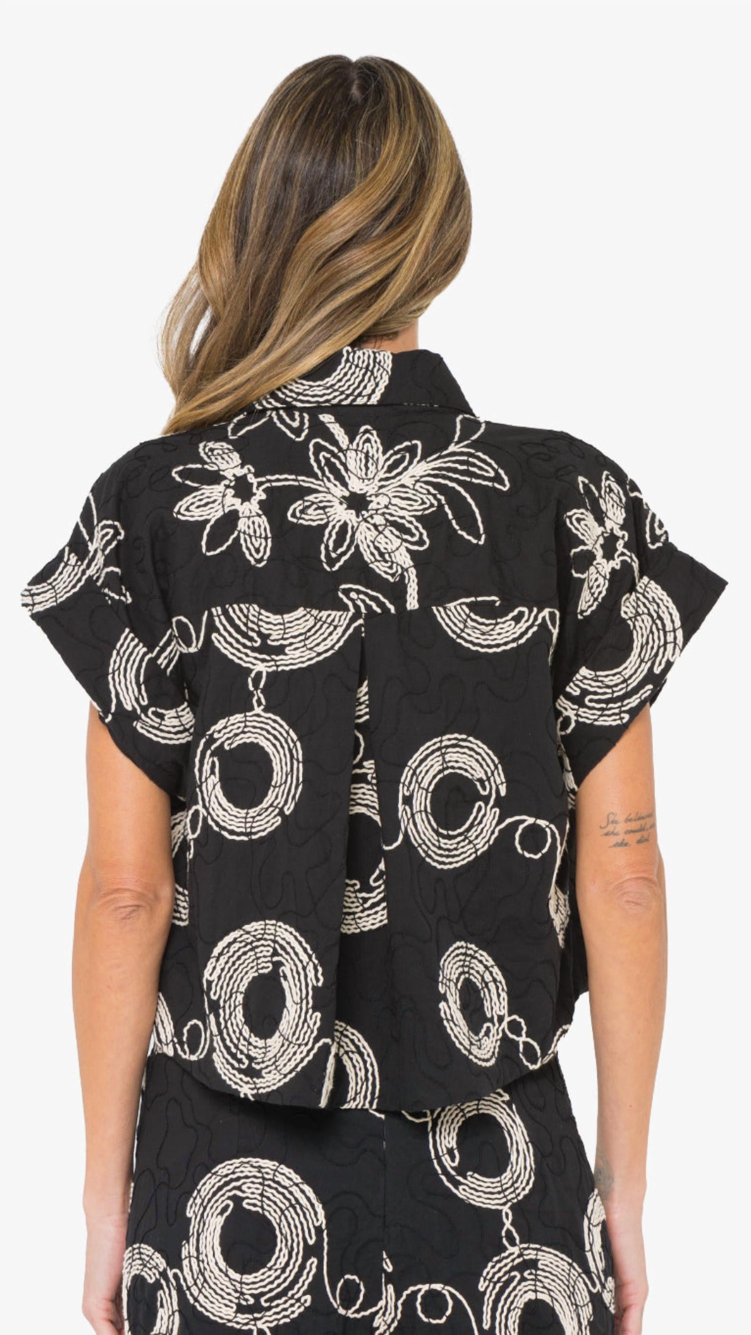 A classic button down shirt that will never go out of style. Introducing the Islie Top by JBQ, a fresh addition to your summer wardrobe. This button-down shirt features cap sleeves and a collared front in a boxy cropped fit for a modern twist. Crafted from 100% cotton, it boasts textured circular embroidery and a lightweight, semi-sheer fabric, perfectly suited for vacation or Y2K-inspired styles. Made in the USA with convenient button closure, this versatile piece ensures you stay effortlessly chic. Model is 5'9" and wearing a size Small.