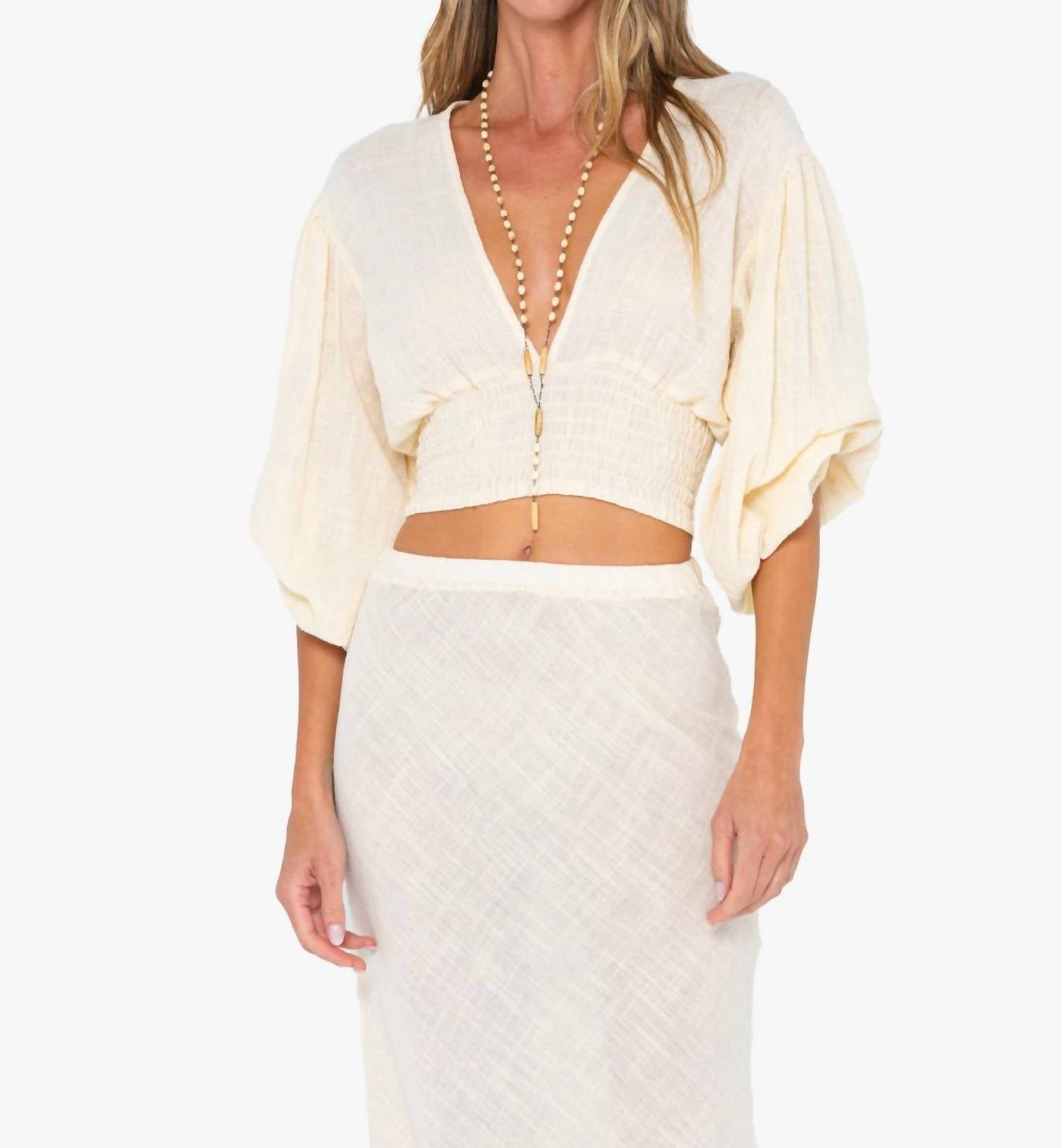 A timeless blouse that will never go out of style. Introducing the Nava V Neck Top by JBQ, a chic summer staple in a lovely vanilla hue. This blouse features relaxed balloon long sleeves with dropped shoulders and elastic cuffs for a comfortable fit. Crafted from 100% cotton, it boasts a cropped length with a wide shirring waistband, ideal for your summer wardrobe. Country of origin: Made in the USA of imported materials. Closure: Pull-on style. Care: Wash cold on a gentle cycle. Model is 5'9" and is wearing a size small.