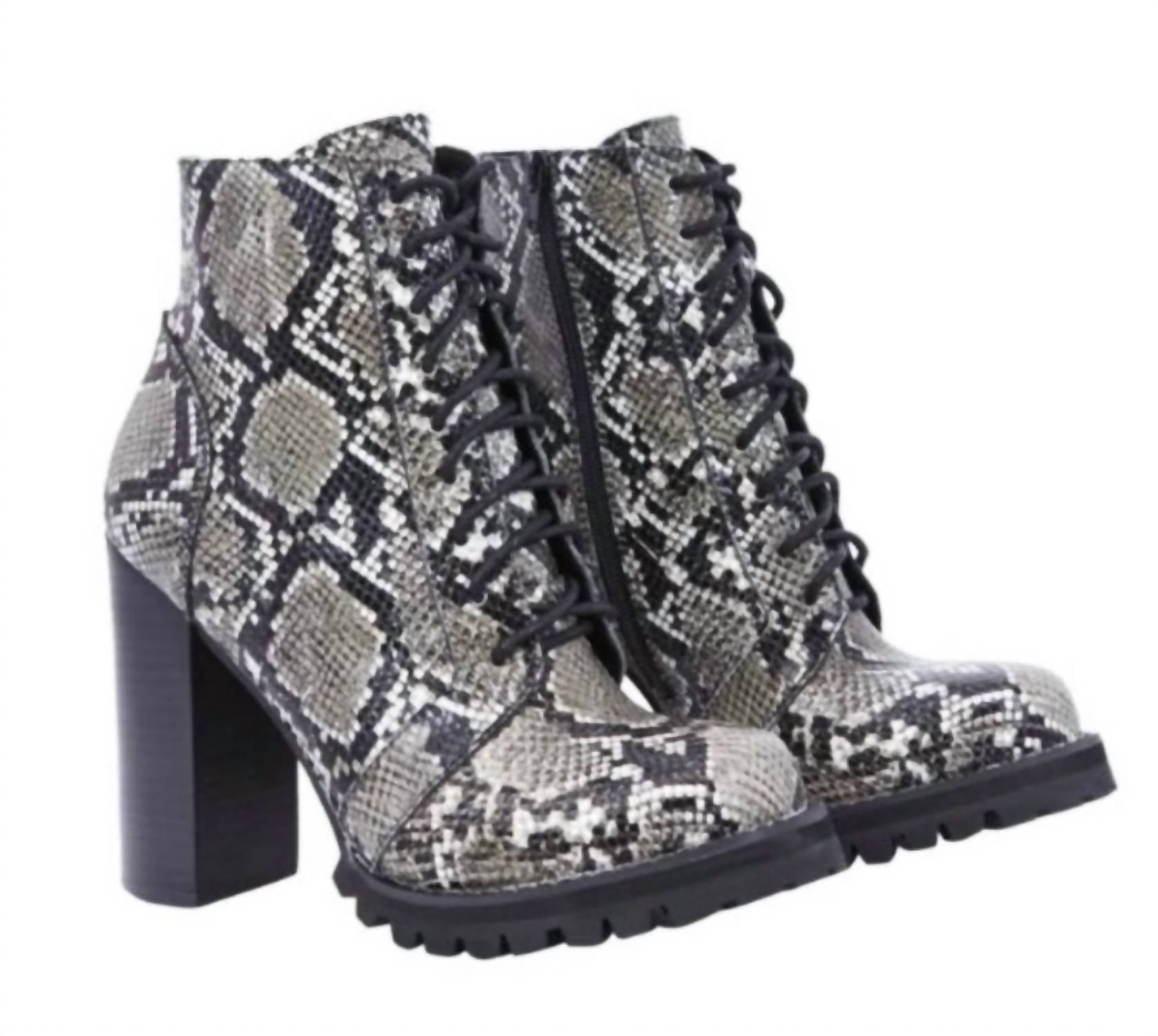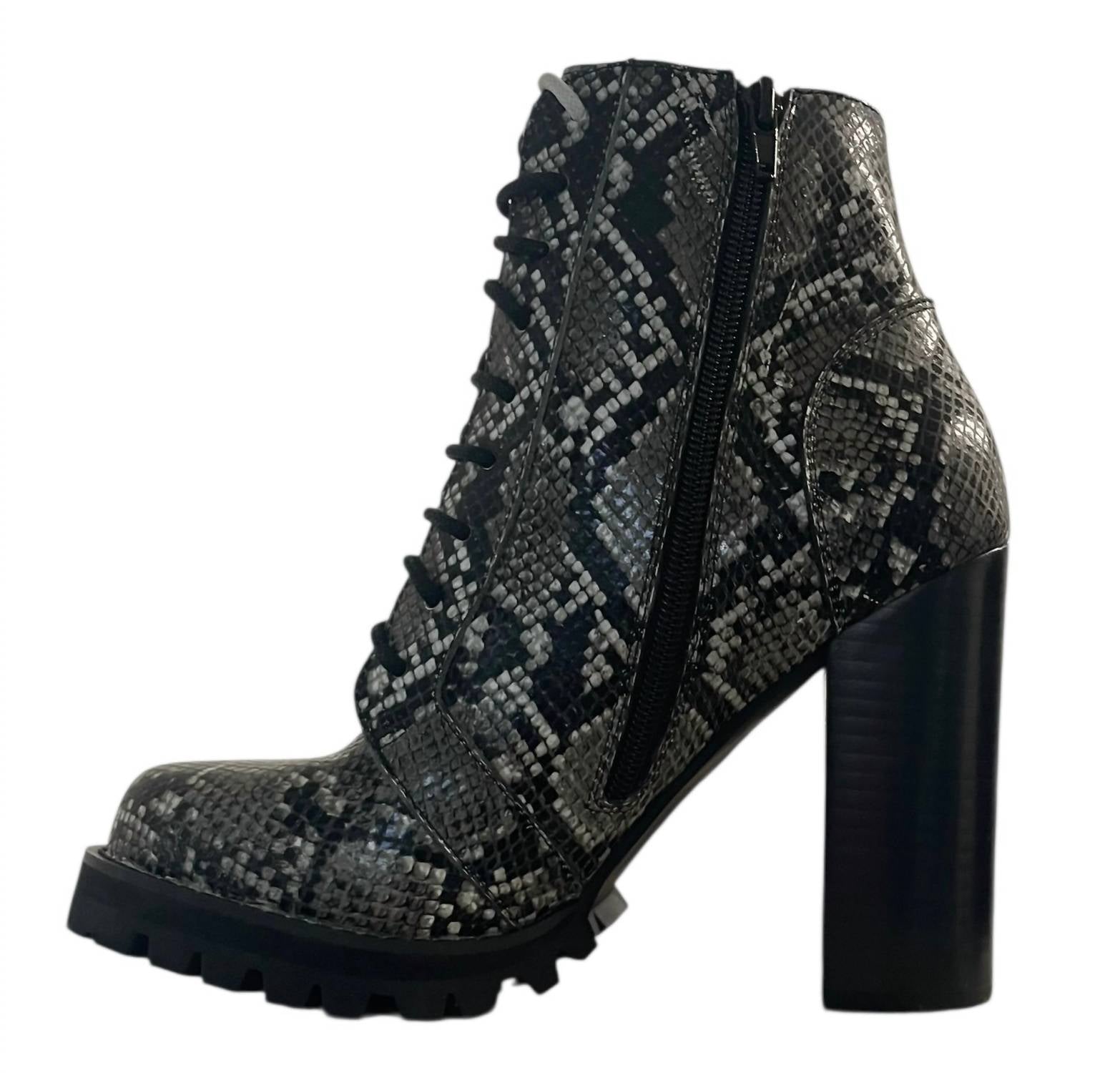 Step out in style and showcase your impeccable taste with these adorable lace-up boots. Keep it casual with a maxi dress, or elevate your look by pairing these boots with the perfect skinny jeans and blazer. Discover the Legion Snake Shoes from Jeffrey Campbell, a stylish addition to your summer wardrobe. Designed as lace-up boots, they feature a round toe and a fashionable block heel, perfect for a concert or any 90s fashion-inspired occasion. These shoes are tailored for women and come in a sophisticated Legion Grey. The shoes arrive new in their original box, emphasizing Jeffrey Campbell's dedication to quality and style.
