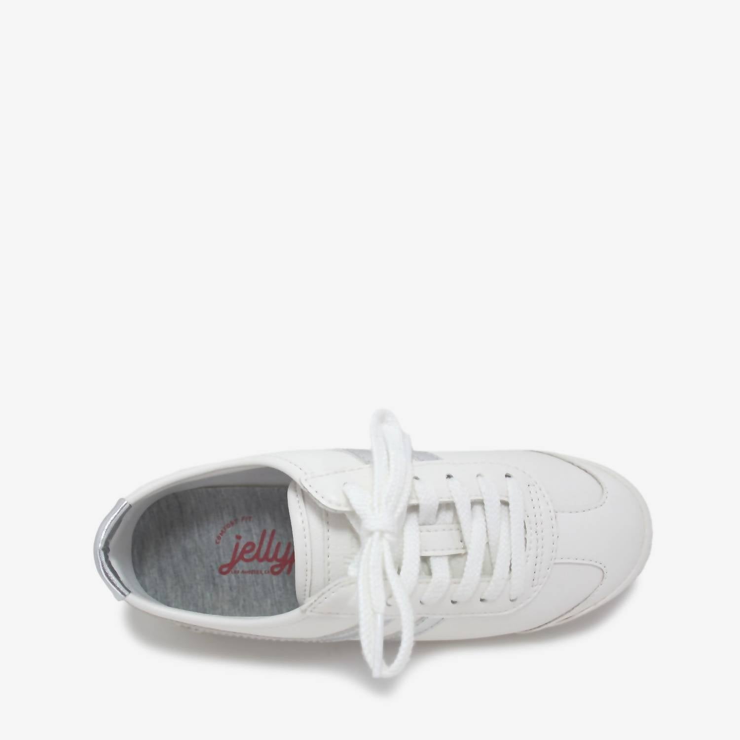 When fashion and function come together seamlessly. Experience the Women's Galaxy Sneaker by Jellypop, a blend of classic silhouette and retro detailing in a chic Silver/White color. Designed with a vegan leather upper and fabric lining, these sneakers promise comfort with a cushioned insole. The synthetic sole contributes to its durability, while the modest 0.5-inch heel adds just a touch of lift for everyday wear. Imported and crafted for adult women, this sneaker features a round toe shape for timeless elegance.