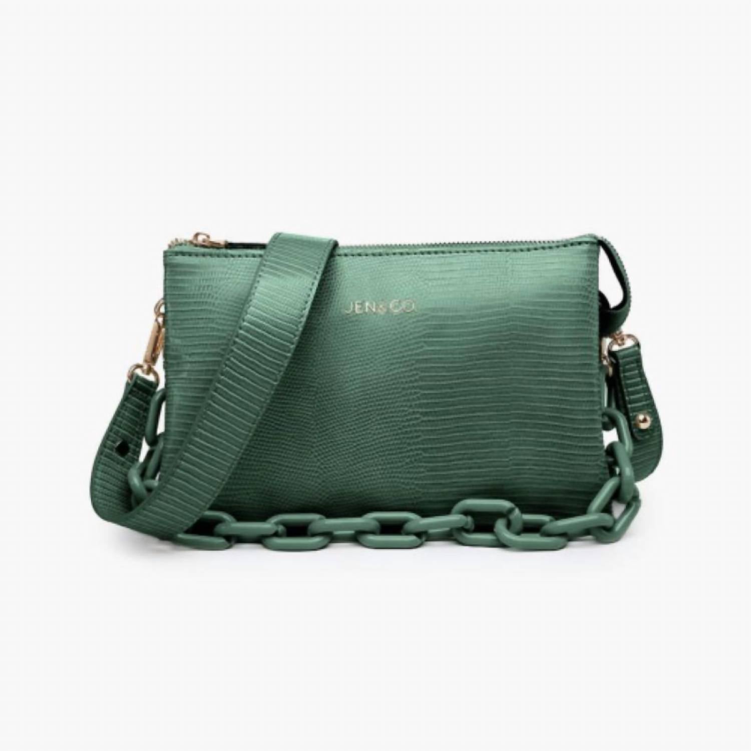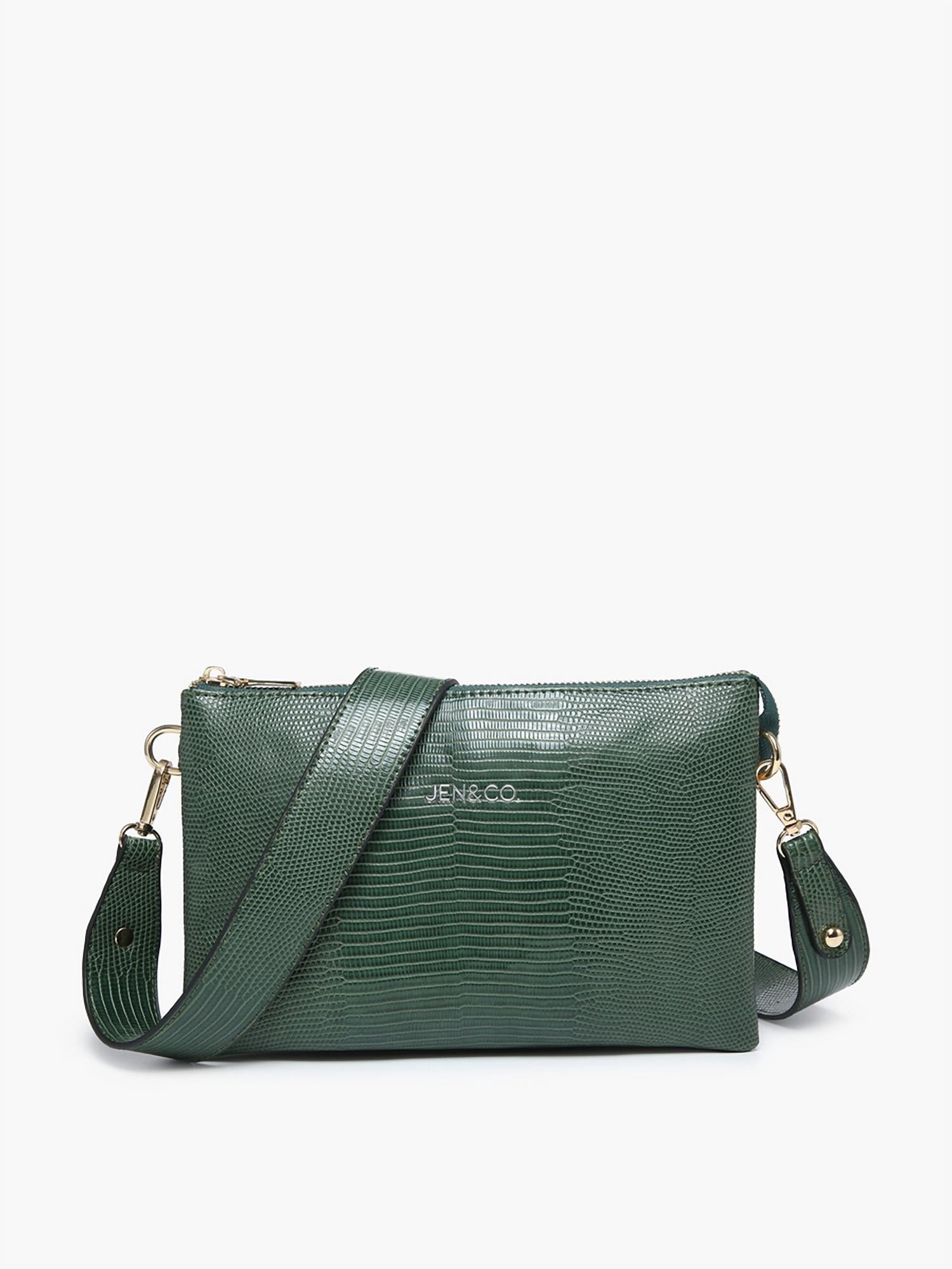 A casual and cute take on everyone's favorite crossbody bag.This crossbody bag features two significant compartments and a middle zip compartment. It comes with a detachable wristlet strap and a fashionable guitar strap. Made from textured lizard-pattern vegan leather. Dimensions: 10"L x 2"W x 7"H.