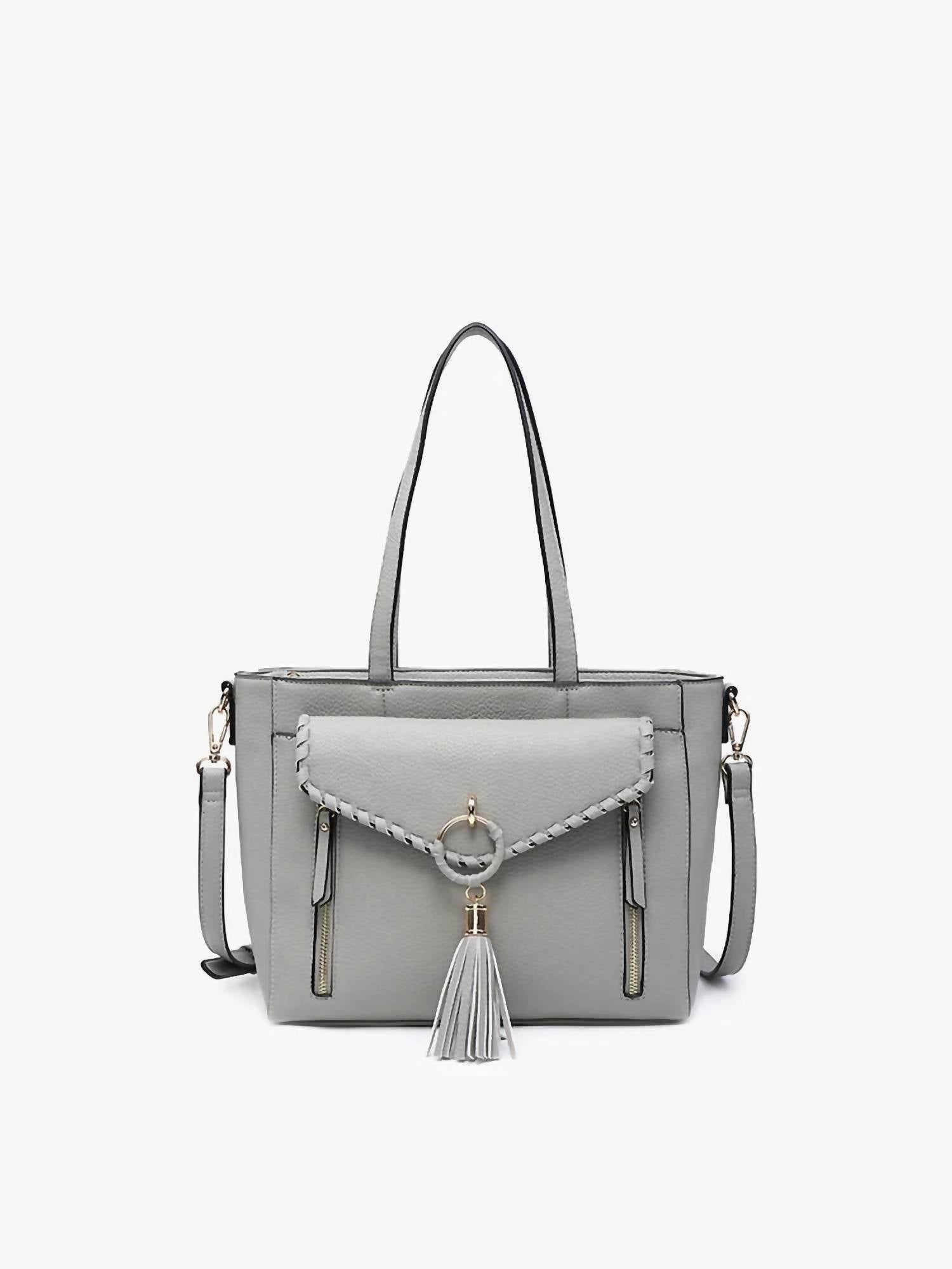 The perfect throw-it-in-and-go bag for your next weekend away or beach vacation! Its classic design will never go out of style and you'll be reaching for this bag season after season.Masterpiece in grey that combines elegance with everyday practicality. Crafted to perfection. Thoughtful designs. Whipstitch envelope detailing with decorative ring and tassel adds a touch of sophistication. Dual front zip pocket and back zip pocket offer ample storage space for your belongings. Top zip closure ensures the security of your items while providing easy access. Adjustable and removable crossbody strap allows for versatile carrying options.
