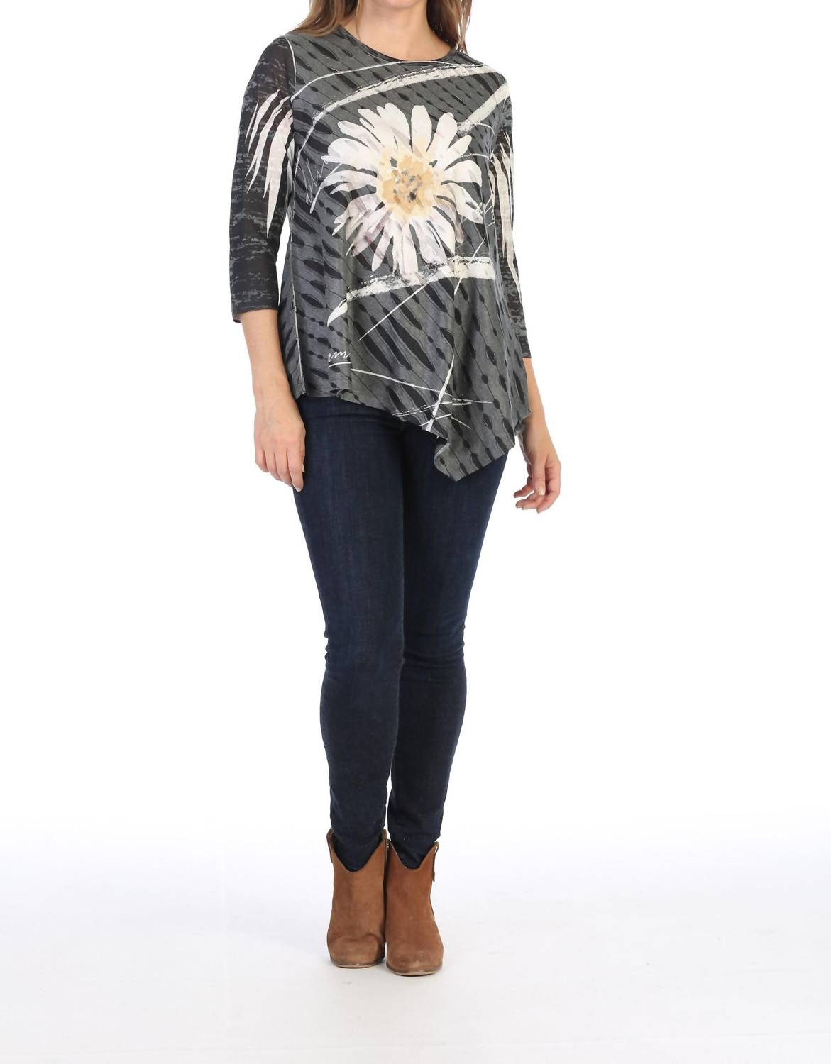 A timeless blouse that will never go out of style. Discover the Women's Chit Chat Double Knit Asymmetrical Top by Jess & Jane, a statement piece in elegant grey. With three-quarter sleeves and a scoop neckline, this top showcases a stunning sublimation floral print with a burnout pattern. Made from a lightweight blend of 65% Polyester and 35% Rayon, it features an asymmetrical hemline tailored in an A-line shape, crafted in the USA. Sizes range with a bust dimension from 42" to 54" and a length of 27" to 28". Care instructions are a simple cold wash and line dry.