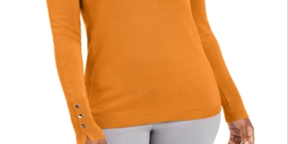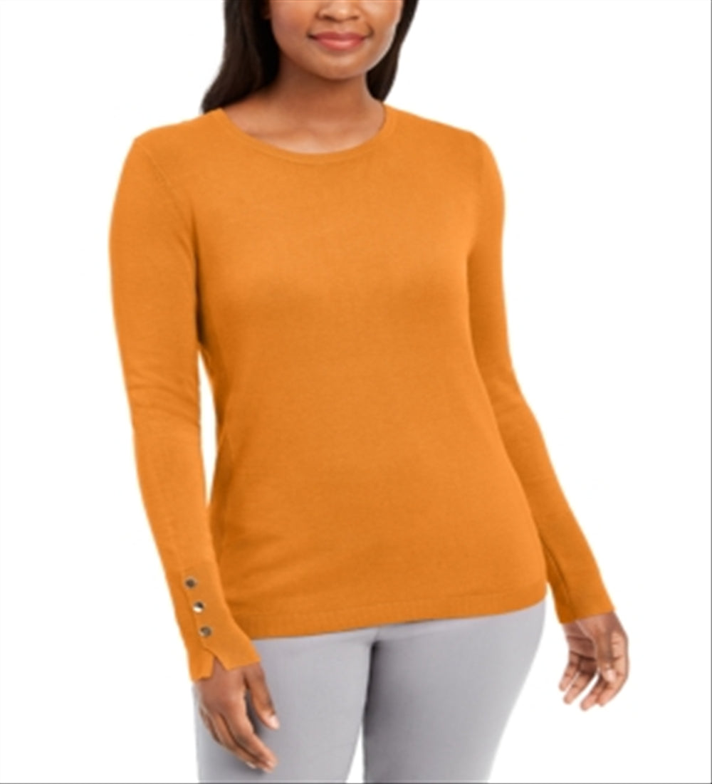 soft and sleek with a classic crewneck and solid knit| jm collection's timeless long-sleeve sweater is finished with chic metallic decorative buttons at the cuffs