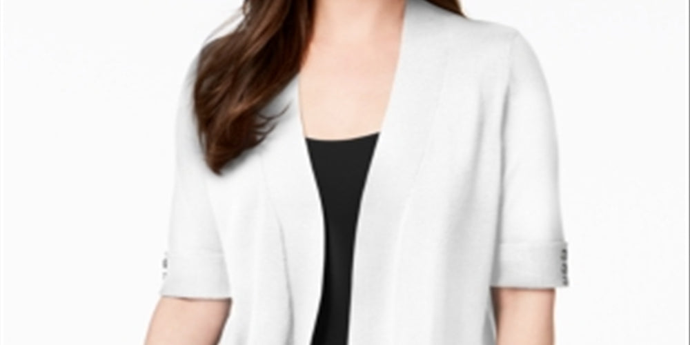 JM Collection's cropped cardigan is a graceful finishing touch with everything from dresses to jeans. | Open neckline and front; no closures| Elbow sleeves with ribbed cuffs and button details| Hits at waist| Generous sizing; if in-between sizes| consider sizing down