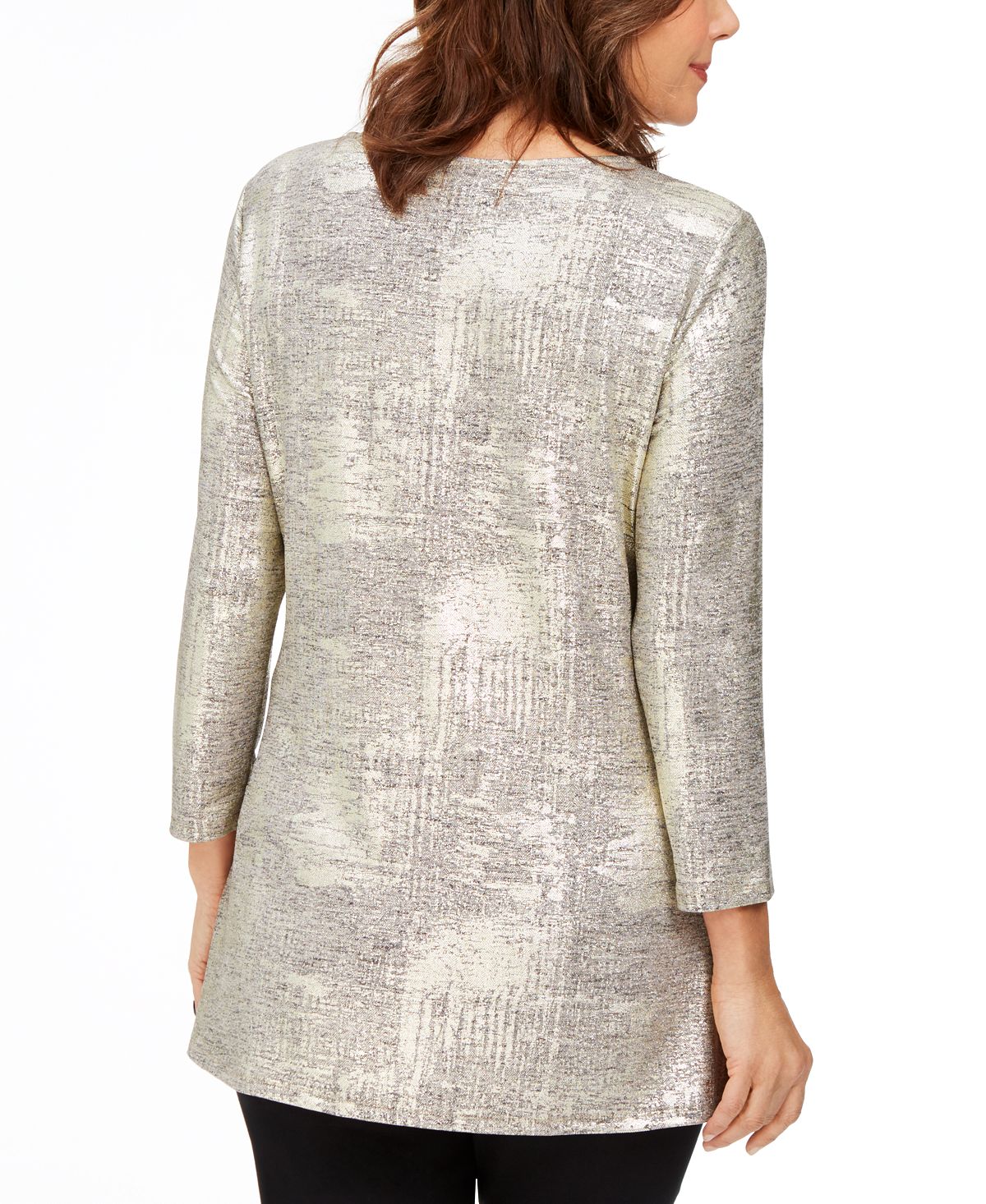 Distinctively chic; JM Collection' petite space-dyed top features a glittering| embellished zipper detail at the hem for added sparkle.| Relaxed fit; approx. 25 long| Designed to fit and flatter 5'4 and under frame| Scoop neckline| Rhinestone-embellished zipper detail at left front hem and front hem| 3/4-sleeves