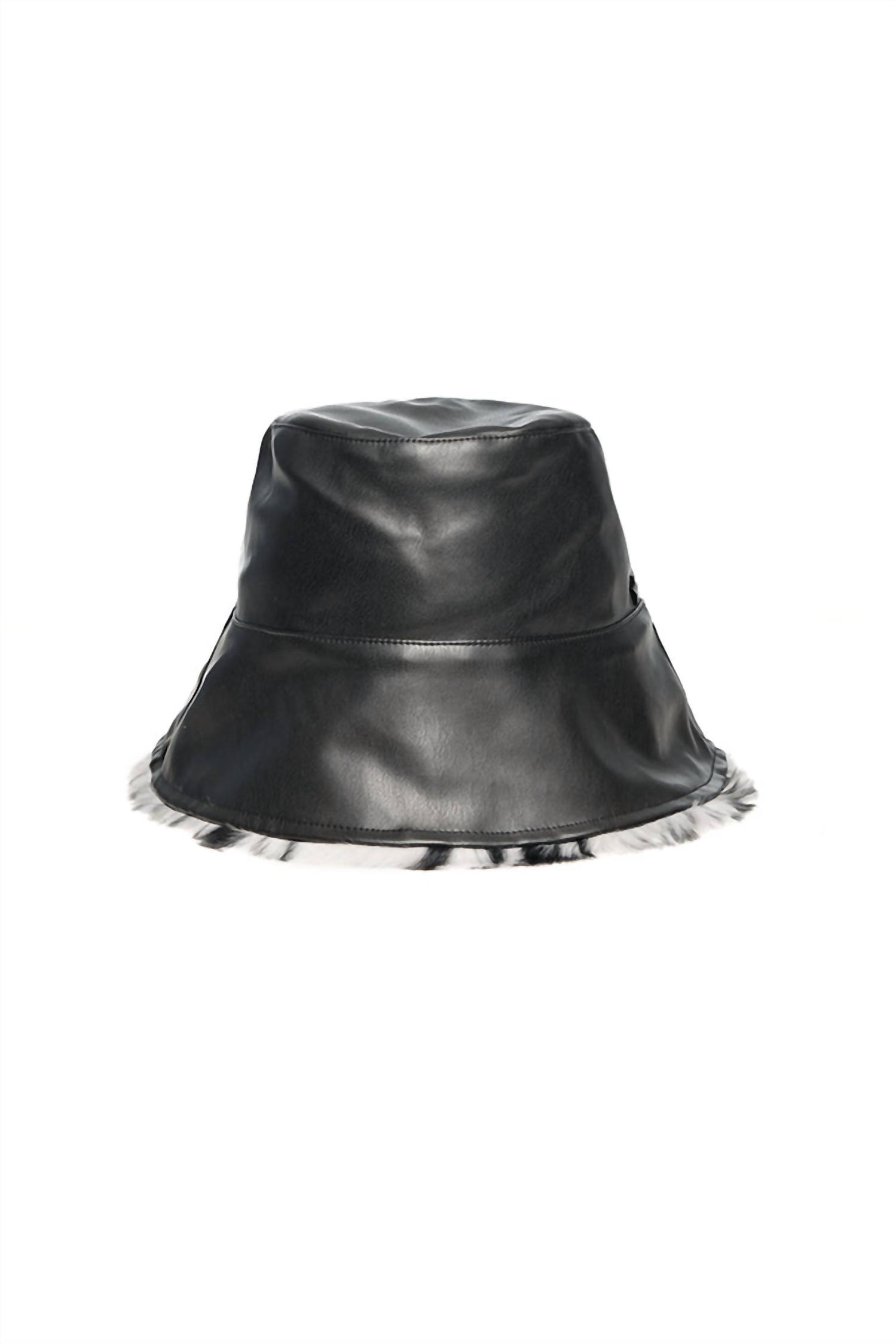 Block the sun in style with this adorable hat that will complement any outfit. Expertly crafted to elevate your style while providing a delightful touch of personality. Reversible faux leather bucket hat with an old-school vibe. Unique design with standout details. Faux fur made from 100% polyester. Shell made from 100% polyurethane. Lining made from 100% polyester. Hand wash cold separately, Do not bleach, Dry flat, Do not iron.