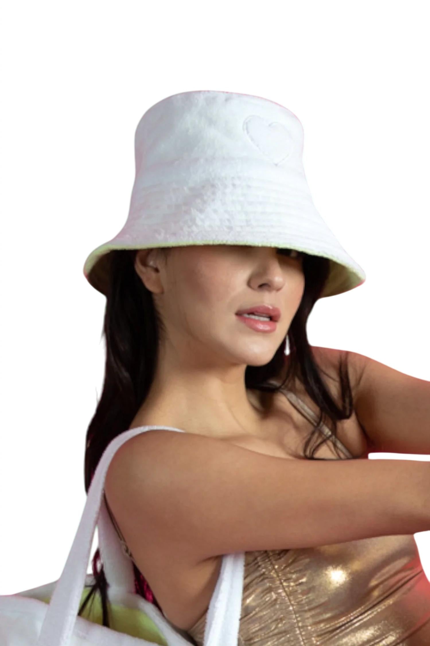 Block the sun in style with this adorable hat that will complement any outfit. Expertly crafted to elevate your style while providing a delightful touch of personality. Introducing the Women's Santorini Bucket Hat by jocelyn, a stylish and versatile accessory ideal for sunny days. This bucket hat is crafted from soft terry cloth and features a charming heart imprint. The white hue adds a touch of elegance, making it a perfect addition to any ensemble. Embrace this chic piece for ultimate sun coverage with a fashionable twist.