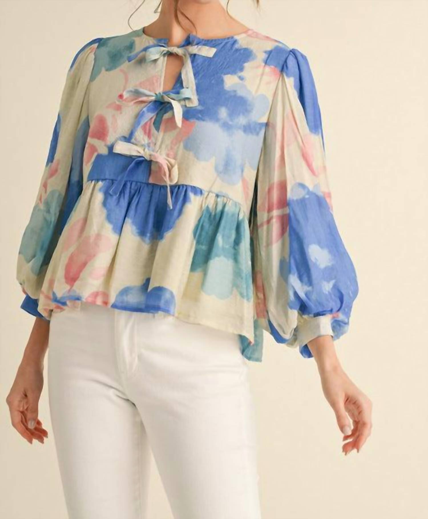 A timeless blouse that will never go out of style. Elevate your spring wardrobe with the Meyer Puff Sleeve Bow Top by Jodifl, perfect for a festive Easter dinner party. This stylish blouse showcases a peplum style with 3/4 length balloon sleeves and a crewneck. Crafted from 100% polyester, it features a charming three-bow functional closure with added coverage between the lowest two bows. With lengths ranging from 21.5" to 22.5" and a bust size varying from 38" to 42", this top promises an impeccable fit. Care instructions specify hand washing to maintain its vibrant colors of Bright Blue, Turquoise, and Geranium Pink.