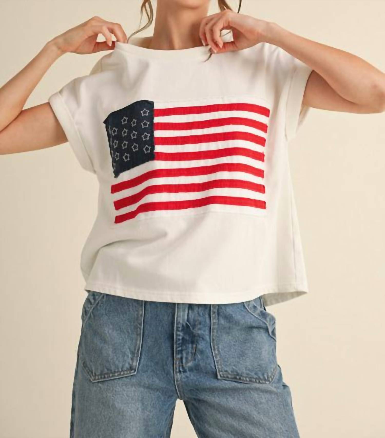 This classic, short sleeve tee will be your go-to staple this season and beyond. Elevate your summer wardrobe with the Ross American Flag Tee by Jodifl, tailored for women in a relaxed fit. This Soft White top features short cuffed sleeves and a crewneck, infused with a playful patchwork flag detail. Made from 80% Cotton and 20% Polyester, it offers comfort and breathability, with 100% Cotton contrast. Enjoy easy wear with its pull-on closure and maintain its quality through hand washing. Available in sizes with a bust measurement of 40" for S and a length of 22.5" for M, this tee is perfect for Fourth of July celebrations.