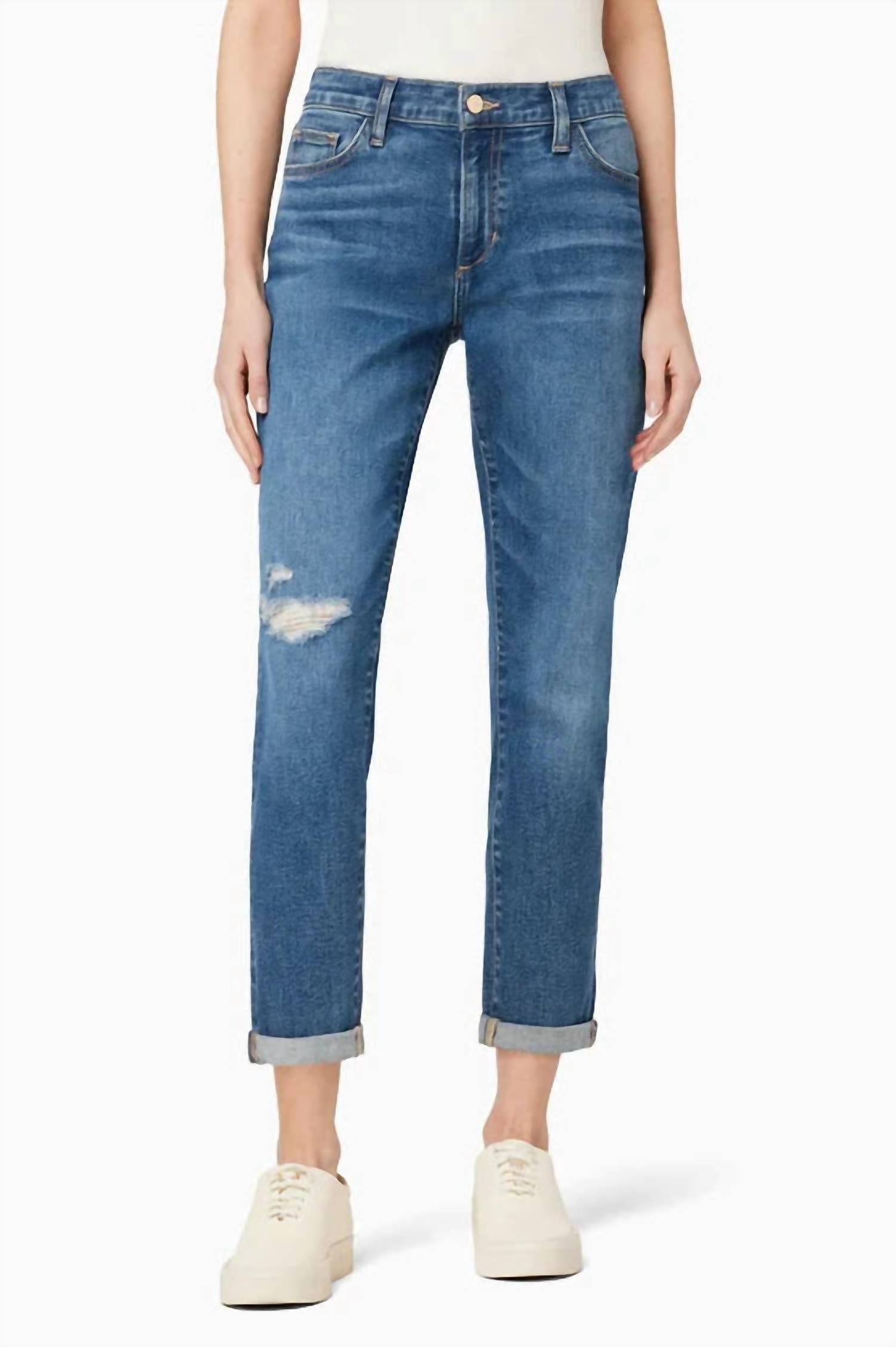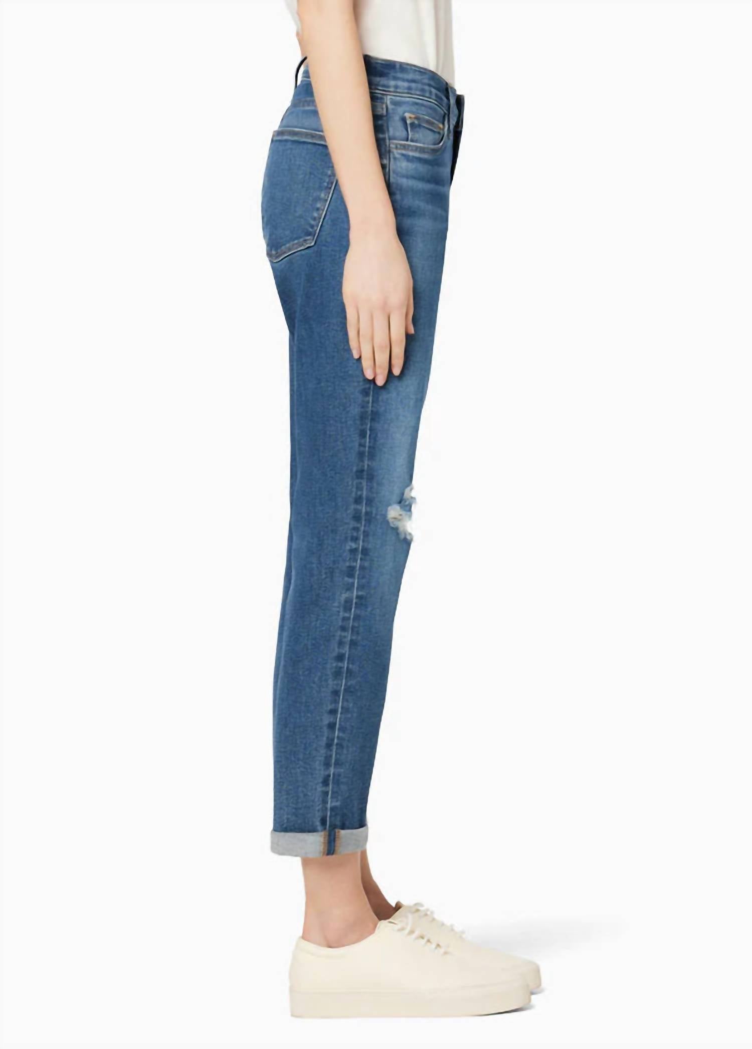 a laid-back feel while still surprisingly form-flattering. Elevate your jean collection with the Bobby Boyfriend Jean by Joe's Jeans, perfect for women seeking effortless streetwear style. Designed in a mid-rise fit with a straight leg, these jeans are made from a cotton blend consisting of 93% cotton, 6% elastomultiester, and 1% elastane to provide a comfortable stretch. The sustainable dark-medium wash "Be The Light" features handsanded whiskering and knee destruction for a trendy look, accentuated by classic five-pocket styling and a button closure. Ideal for summer, these jeans are perfect for a dinner party or celebrating the 4th of July.