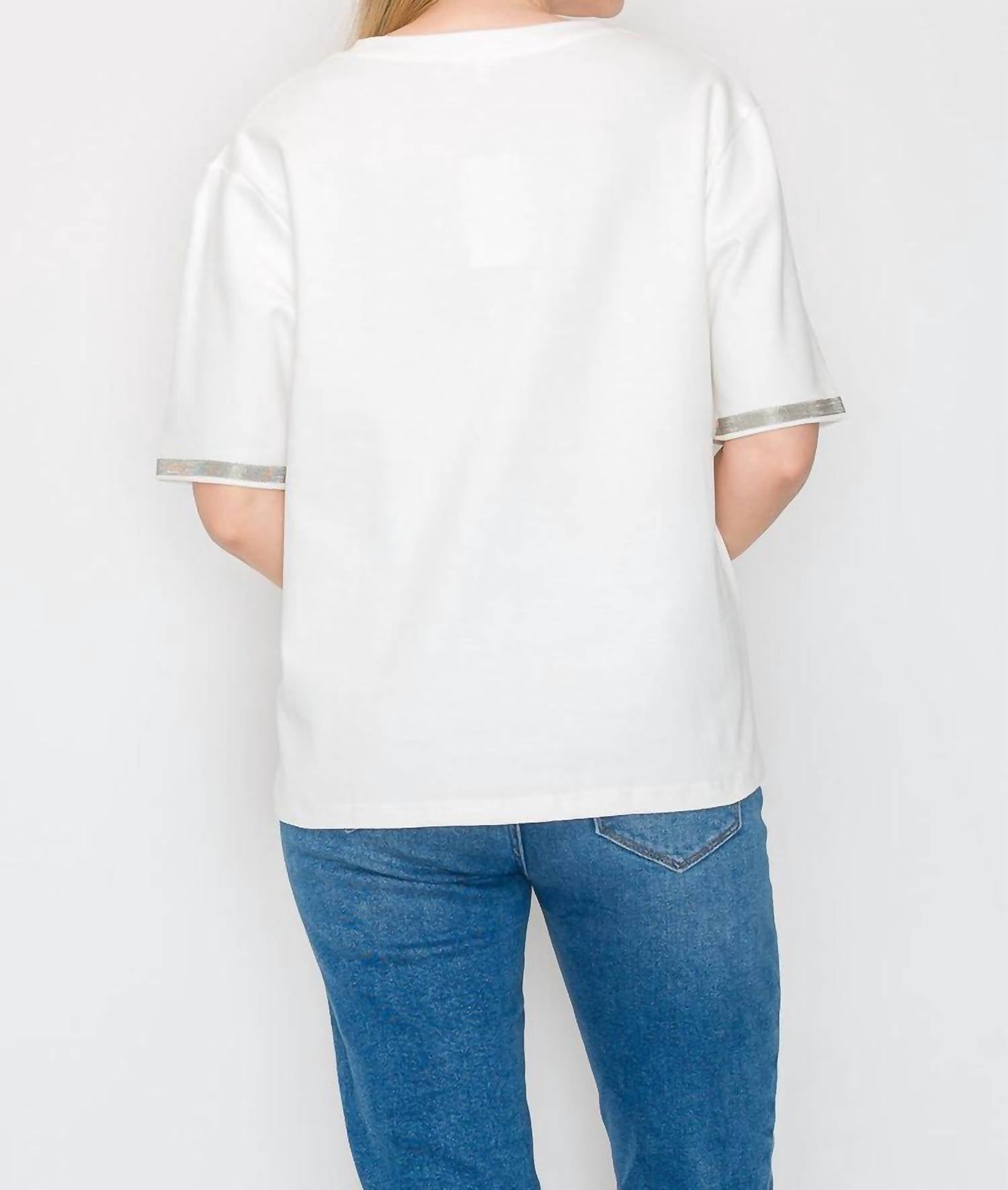 This classic, short sleeve tee will be your go-to staple this season and beyond. Presenting the Roxi Top by JOH, your new wardrobe essential in classic white. This piece features short sleeves and a round neck, crafted from high-quality stretch pointe knit fabric for a relaxed fit. Adding a modern flair, the top is accented with metallic trim on the front and sleeve hems. Closure: Pull-on design, ideal for everyday wear.