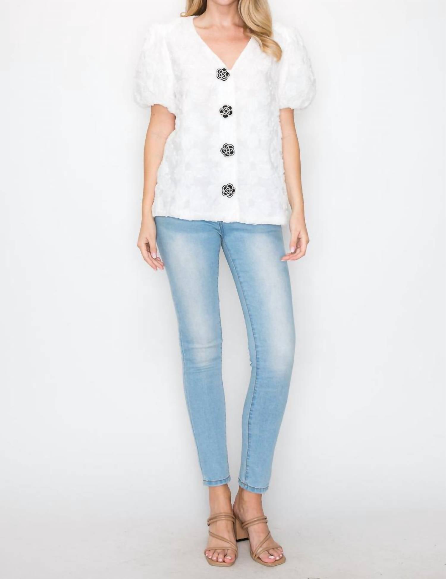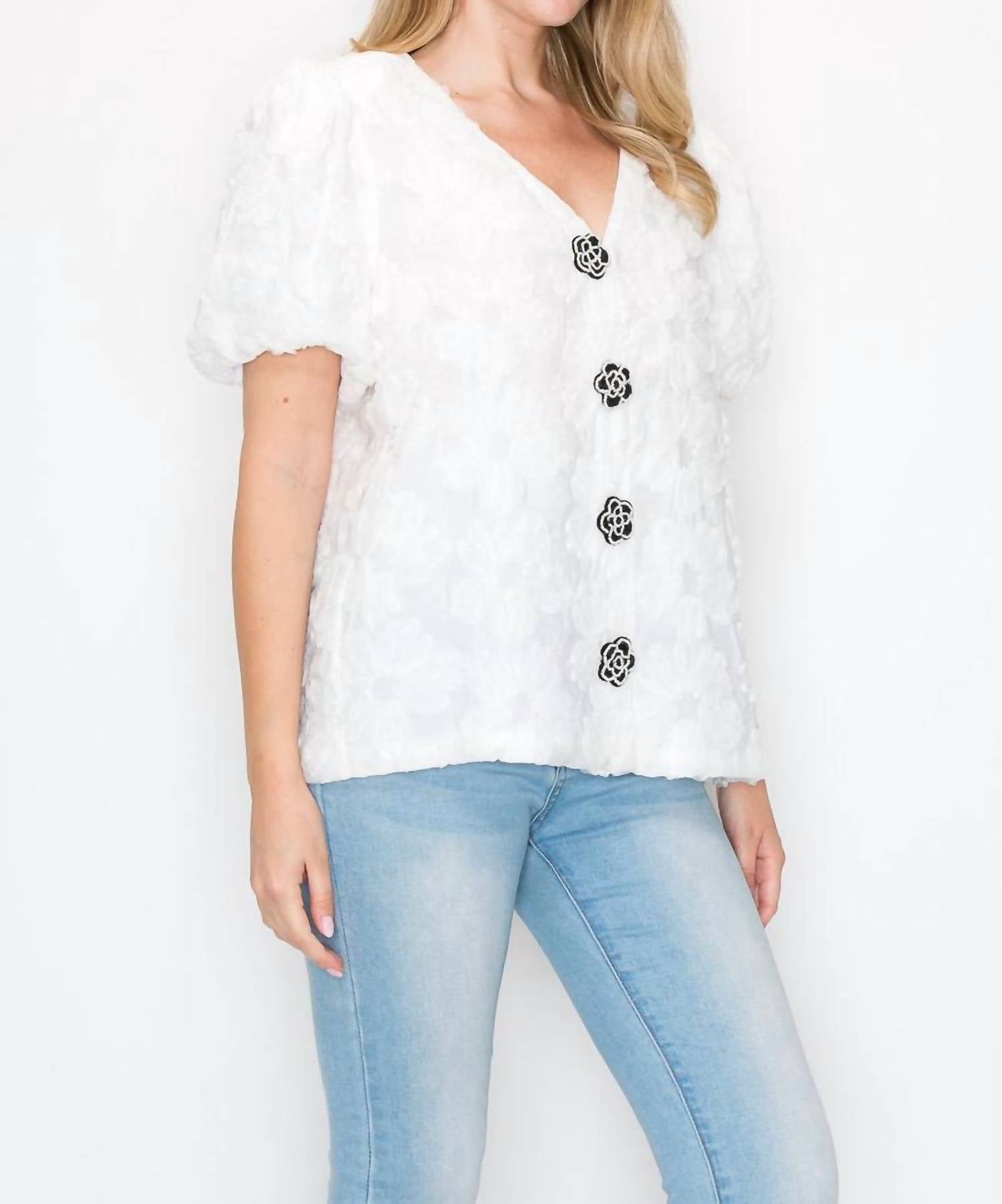 Meet the Wendy Top by JOH, a sweet and lovely addition to your wardrobe. Crafted in white with textured woven lace, it features a front V-neck and slightly puffed short sleeves for a feminine touch. This stylish blouse boasts a relaxed fit with charming flower button closures. Embrace chic elegance with this timeless piece.