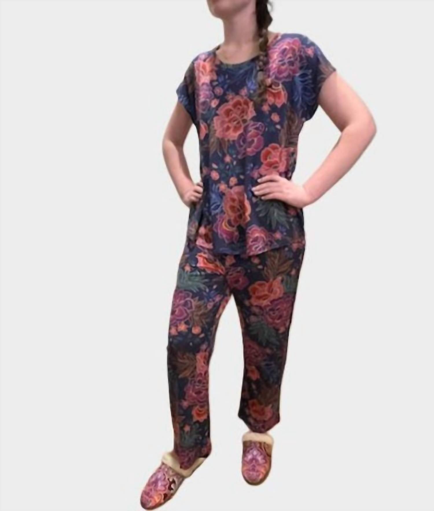The perfect piece to lounge in, sleep in, and cook breakfast in. The Bobbie Crop Set is designed for comfort and style, made from an incredibly soft cotton blend. It features a crewneck tee with short sleeves and coordinating cropped pants with a comfortable elastic waist. The pajamas are adorned with floral icons for a dreamy aesthetic. Pair the set with a comfy robe and matching slippers for a cozy night in. Model is 5'4" and wearing a size Small. Machine Wash