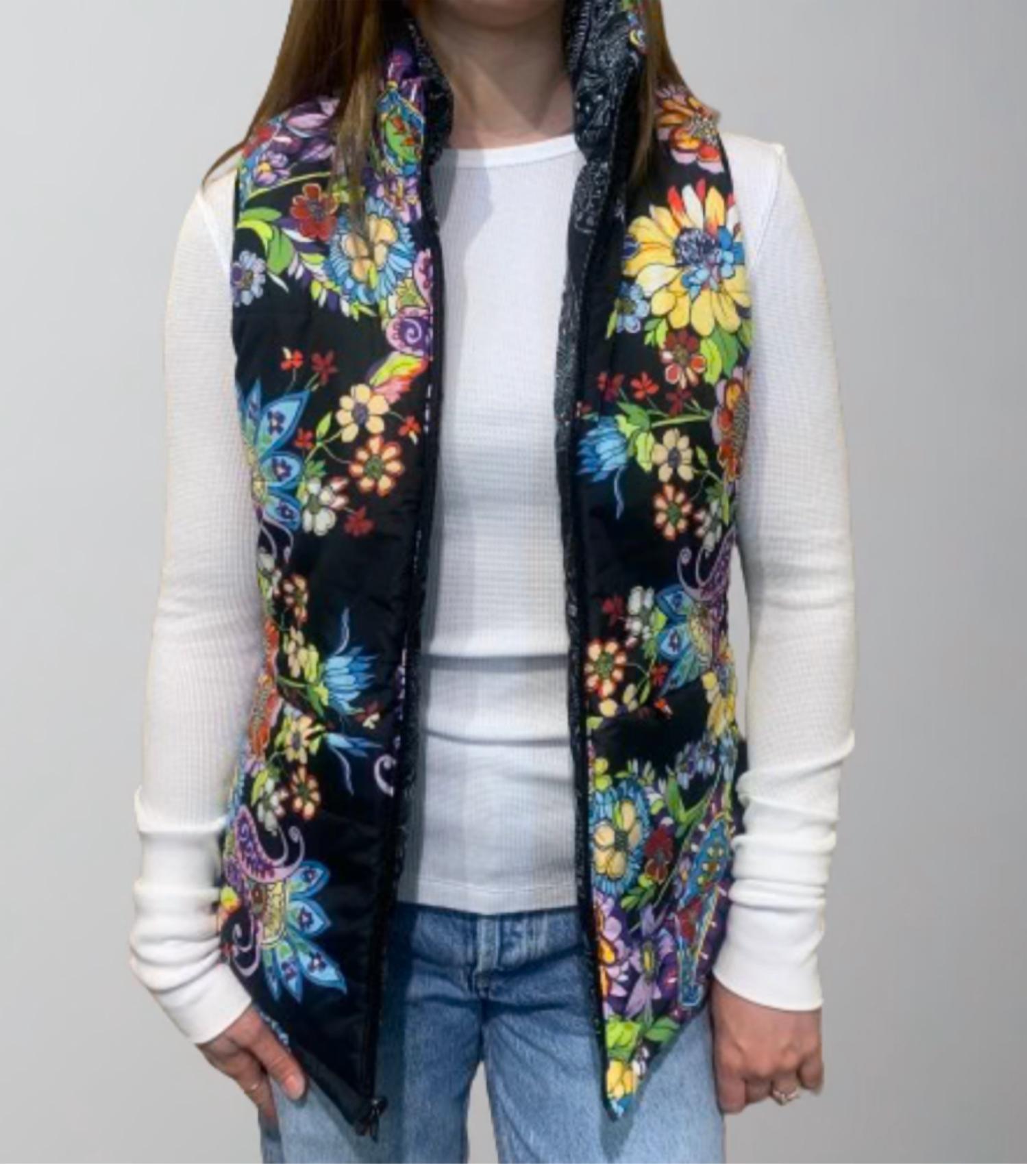 Cozy, cute and timeless. The puffer jacket that will keep you warm all season long. Discover the Johnny Was Braemar Reversible Puffer Vest, a versatile wardrobe staple. This sleeveless vest is crafted from high-quality polyester, offering warmth and style in the trendy Pealim Chani color. Designed with a convenient zip closure and a chic collar neckline, it features a reversible pattern for dual styling options. Ideal for women seeking to elevate their look with functionality and unique flair.