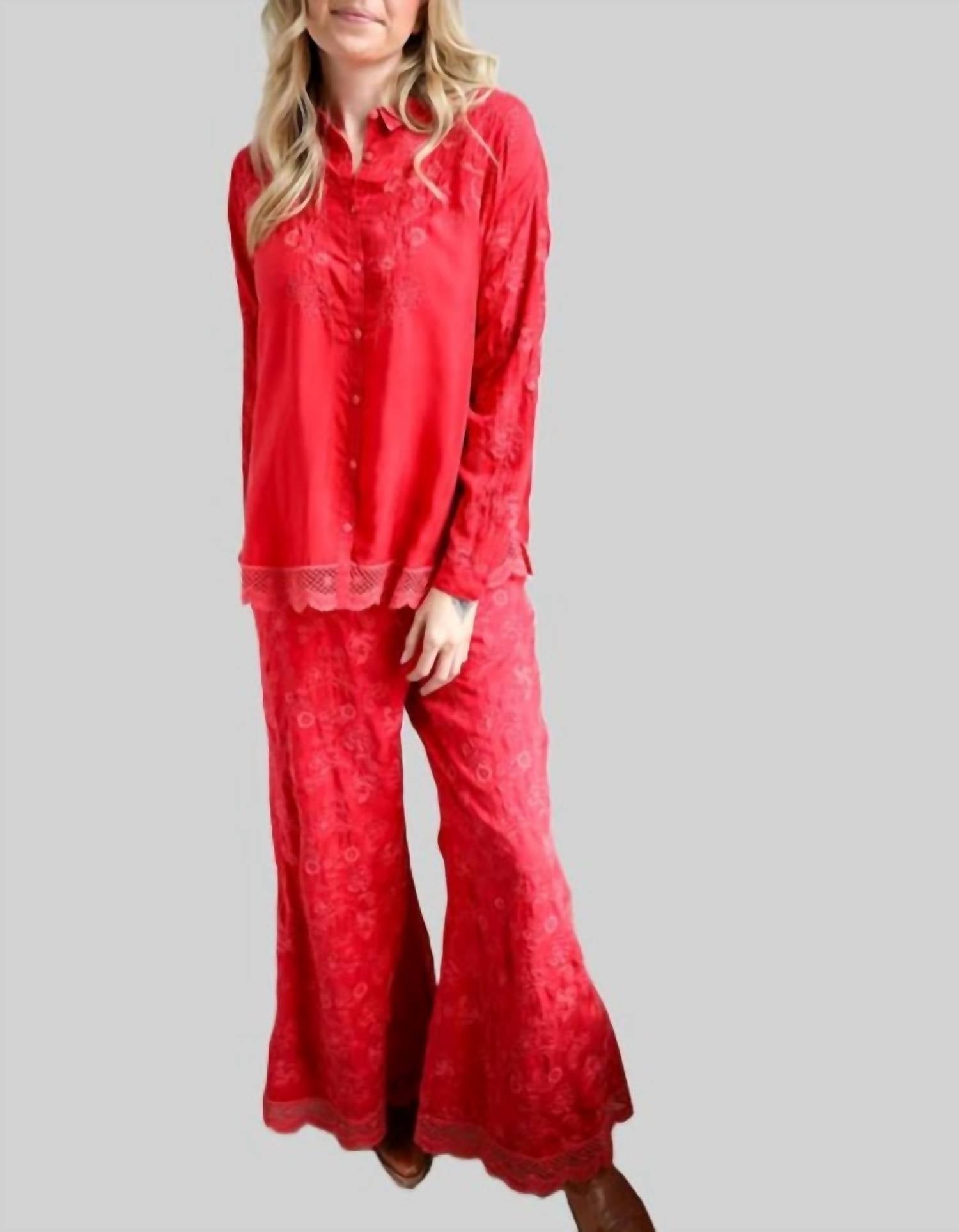 Slightly flared pants are all the rage right now and these are no exception. Pair these with your favorite tee for a more casual look, or with your favorite button-up blouse for an evening out. Add a pop of color to your wardrobe with the Johnny Was Gardenia Lauchlen Pant. These vibrant red pants feature intricate embroidery, handy pockets, a button-and-fly front, and an elastic back for all-day comfort. Fun, functional, and full of personality! Machine Wash