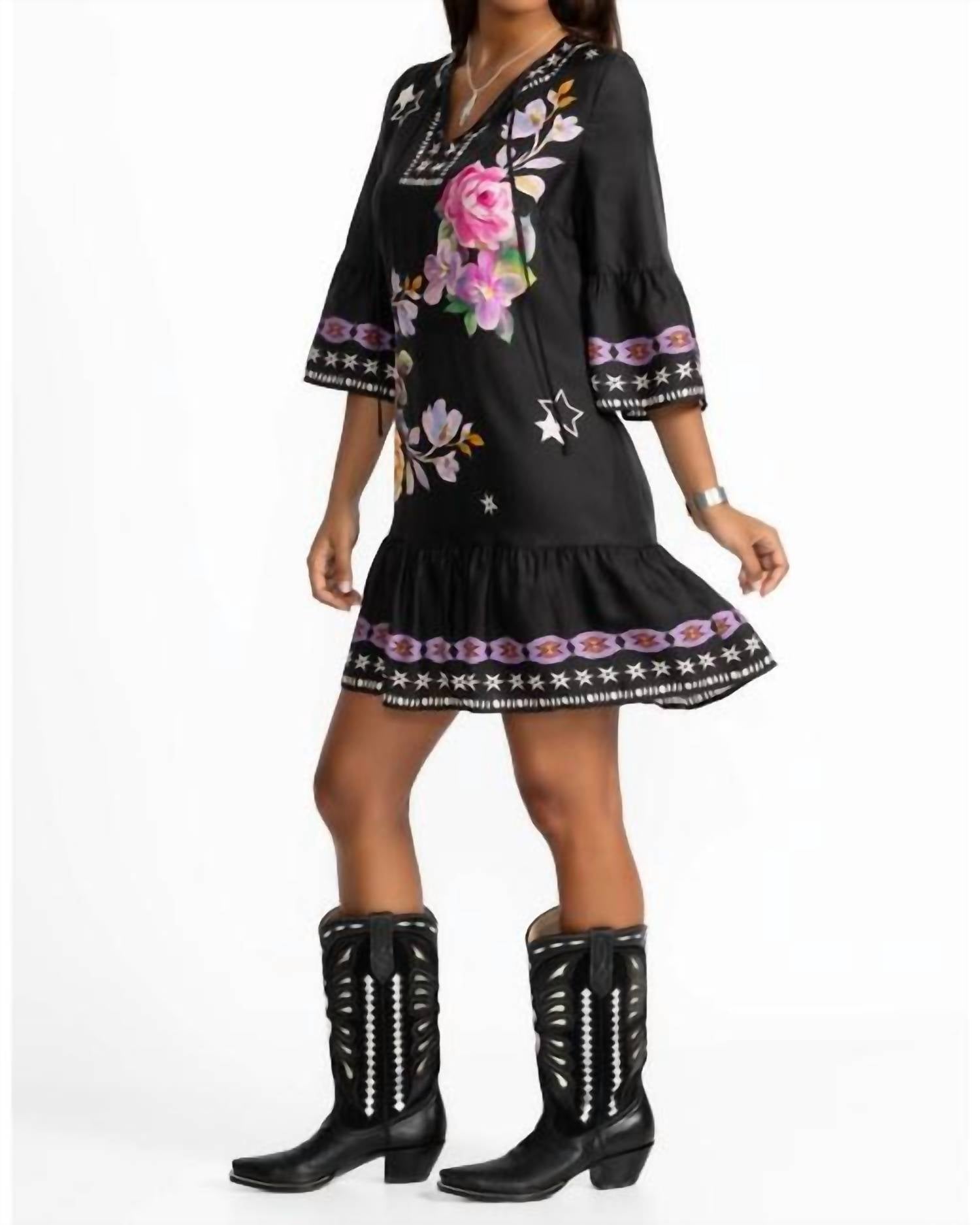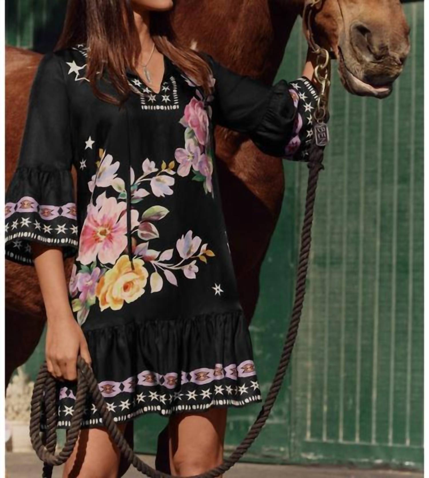 The perfect mini dress for those warmer months. The Hailee Mini Dress is made from a unique silk blend and features a striking floral print on a rich black background. It is thoughtfully designed with a split V-neckline and a relaxed-fit bodice. The dress is finished with colorful ruffled detailing at the sleeves and hemline. Pair it with black sandals and a raffia bag for a resort-ready look.