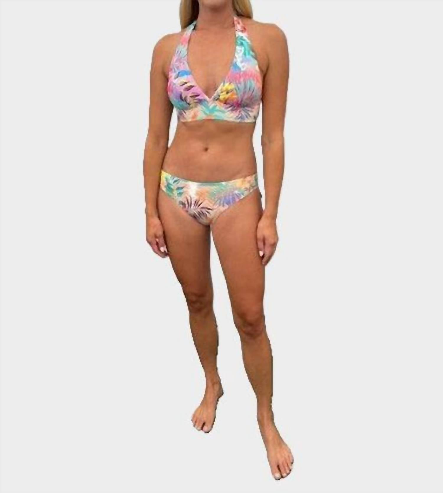 This cute and flattering swimsuit is perfect for making a splash at the pool, lounging on sun-kissed beaches, and staying stylish throughout the upcoming summer season. Ideal for relaxed poolside moments, this adorable swimsuit effortlessly transitions into the perfect sunset dinner outfit when paired with the Zeru Wide Leg Pants. It's a chic addition to your swimwear collection! With sewn-in cups for comfort, this lined top is composed of 83% Polyamide and 17% Elastane, offering both durability and stretch. Designed with a striking multicolored floral print, it features a halter neck and an elasticated hem for a flattering fit. Care is simple - hand wash to maintain its vibrant graphic pattern and exceptional quality.