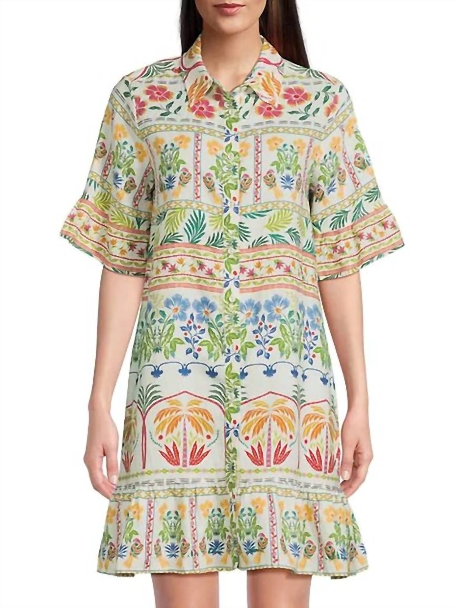 Pair with your favorite sandals for an effortlessly chic look. Made of linen, the Soller shirtdress features a vibrant floral print and boasts flounce trim at the cuffs of its short sleeves and hem for added shape. This comfortable classic also features a spread collar and a button-front closure. Hand Wash