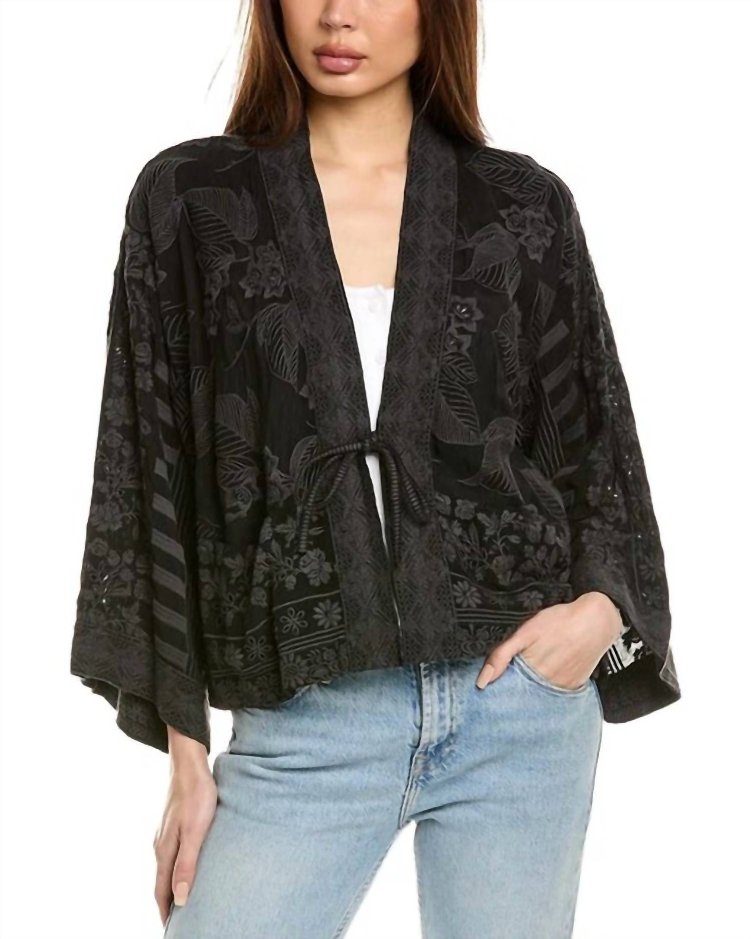 Introducing the Johnny Was Tyrael Kimono, a stylish and versatile addition to your wardrobe. This kimono features a beautiful embroidered design on a black background, perfect for adding a touch of boho chic to any outfit. It is lightweight and comfortable for all-day wear. At approximately 23 inches from shoulder to hem, this kimono is the perfect layering piece for any occasion.