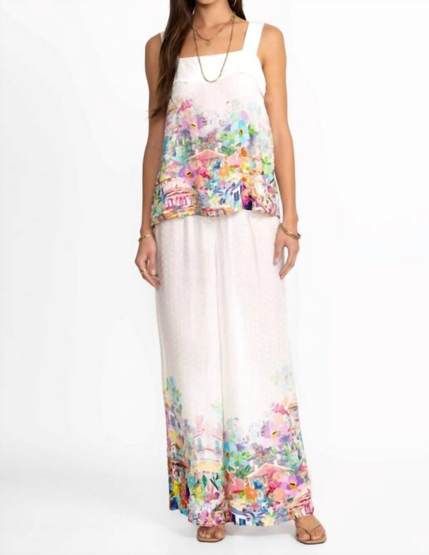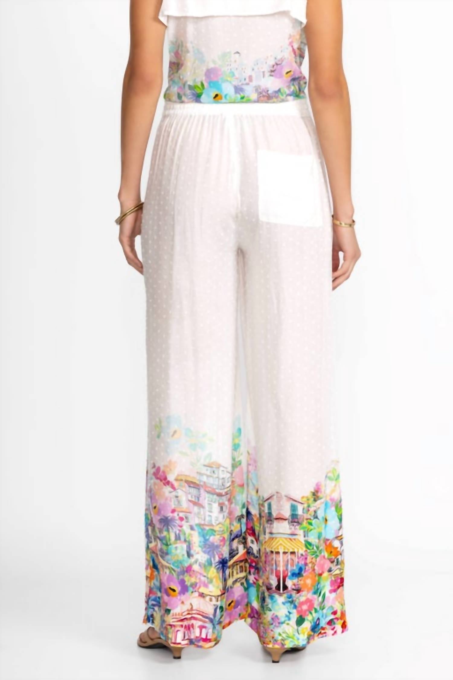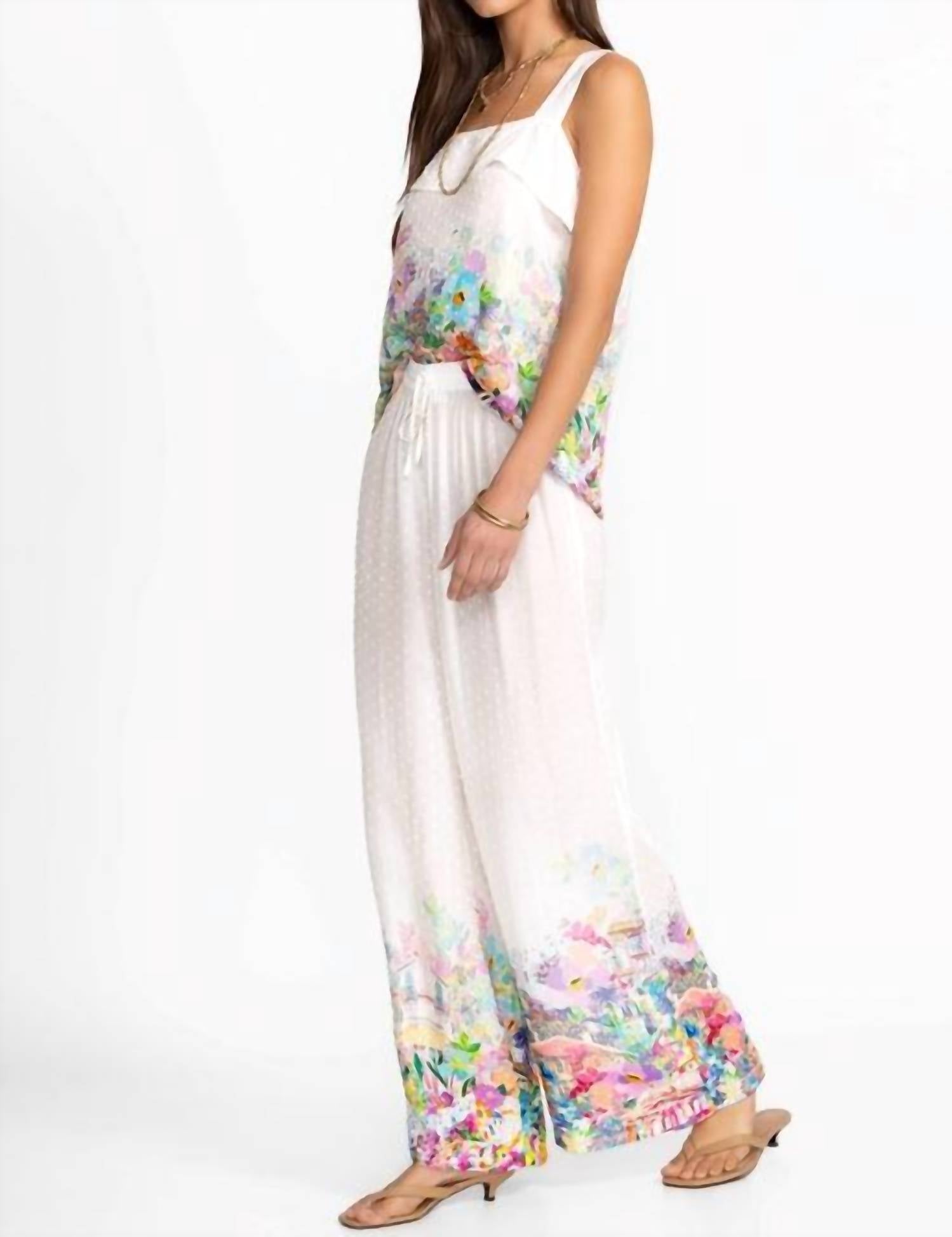 Embellished with a bold floral ombre print against a crisp white backdrop, the Spello Wide Leg pants are crafted from lightweight, flowing fabric. Designed with an elastic waist and a drawcord for a customizable fit, these elegant pants feature slip pockets and wide legs. They are sheer and make a perfect cover-up for a swimsuit. Pair with the Spello Cami Top for a perfectly coordinated vacation-ready look. Machine Wash