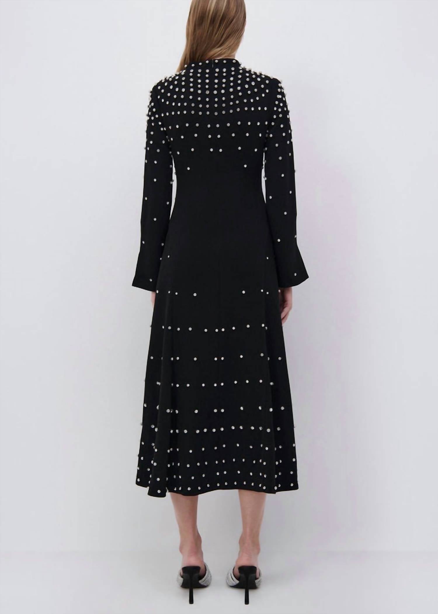 Introducing the Arielle Long Sleeve Mock Neck Midi Dress by JONATHAN SIMKHAI, a sophisticated choice for any upscale event. This black, textured crepe dress features long sleeves with elegant bell cuffs and a mock neckline for a classic touch. Crafted with a blend of acetate and polyester and luxuriously lined with polyester, this A-line silhouette elegantly flares below the knee, adorned with sparkling diamante crystal accents. A concealed zip closure ensures a seamless fit, making it perfect for dinner parties and New Year's Eve celebrations. Care: Dry clean only. Imported.