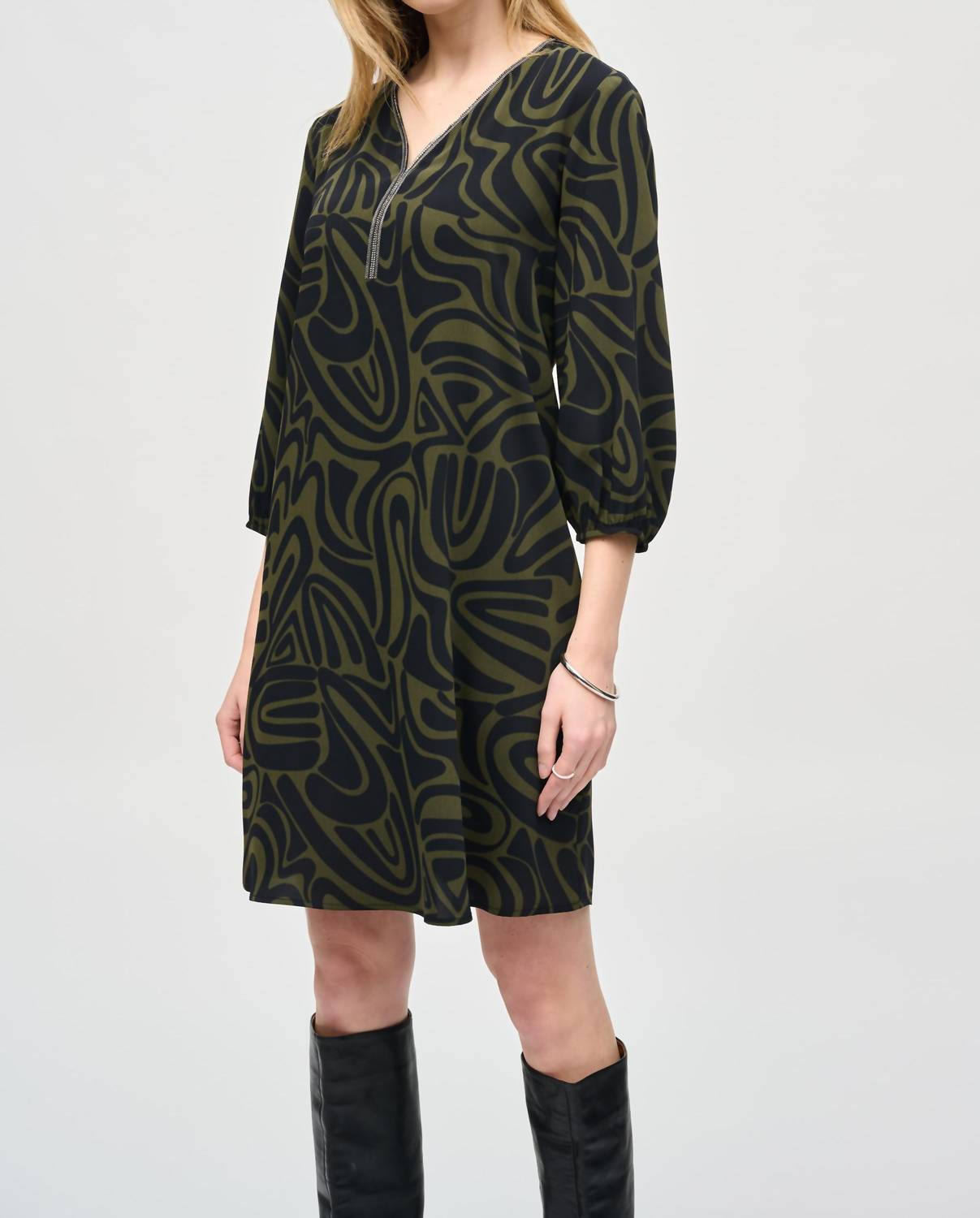 The perfect mini dress for those warmer months. Showcase your bohemian flair with the Bohemian Abstract Puff Sleeve Dress by Joseph Ribkoff, featuring playful three-quarter puff sleeves. Crafted from 100% Polyester, this shift dress in a striking black and green abstract pattern offers both comfort and style. With a mini skirt length of 41 inches, a V-neckline, and a pull-on closure, it's perfect for chic, casual looks. Hand wash and line dry.