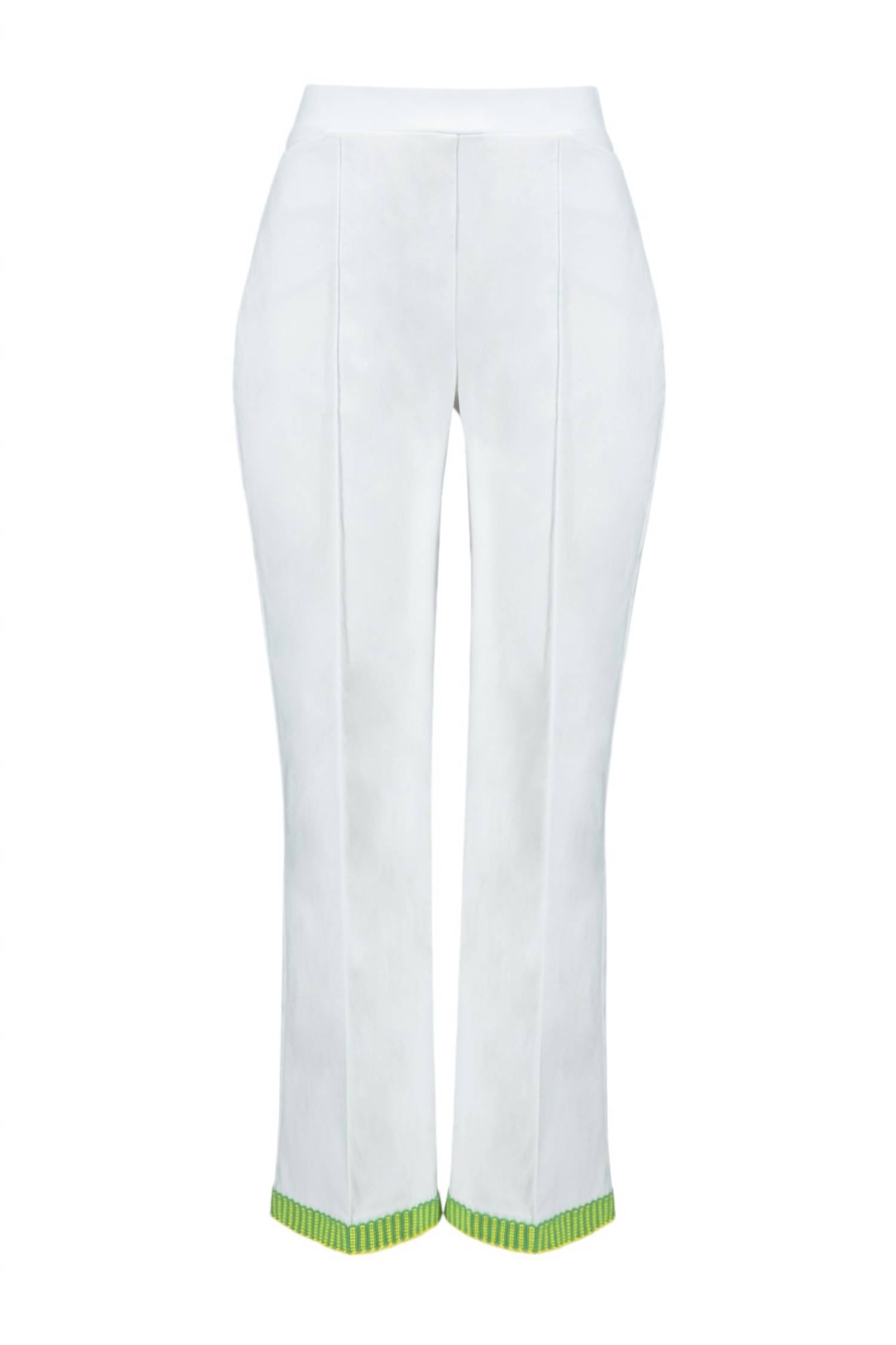 These wide-leg pants are designed to flatter and elongate your leg, featuring a cropped silhouette and a pintuck pleat that runs down the leg. The contrasting embroidery that contours the pant hem adds a touch of elegance. With an elastic waist and side pockets, these pants offer comfort and practicality. Made from a blend of 76% Viscose Rayon, 21% Nylon, and 3% Spandex, they are easy to care for - simply hand wash cold. For reference, the model is 5'9" (175cm) and wears a size 6, showcasing the pants' flattering fit. The approximate inseam length of the pants in a size 12 is 28". Proudly made in Canada.
