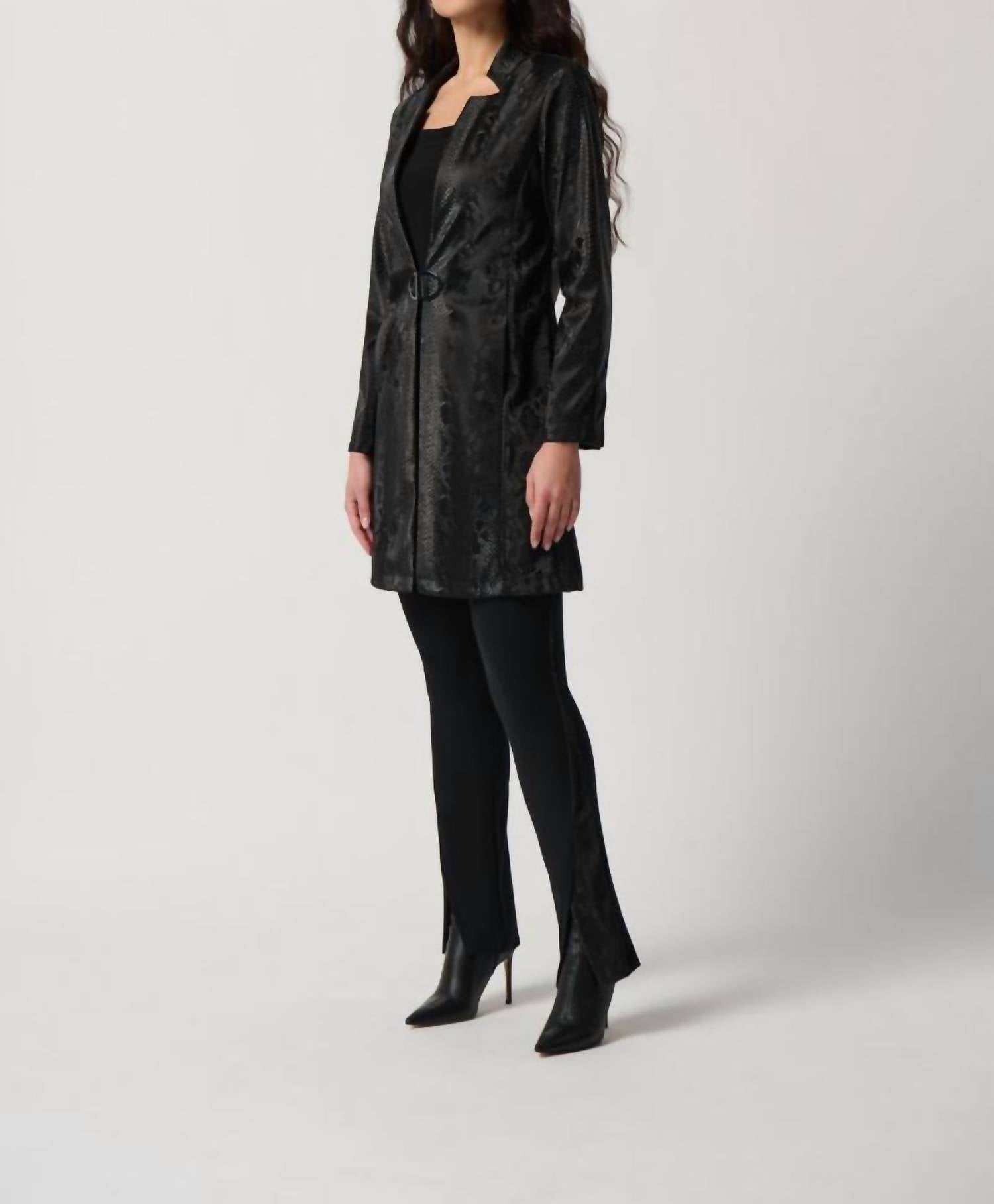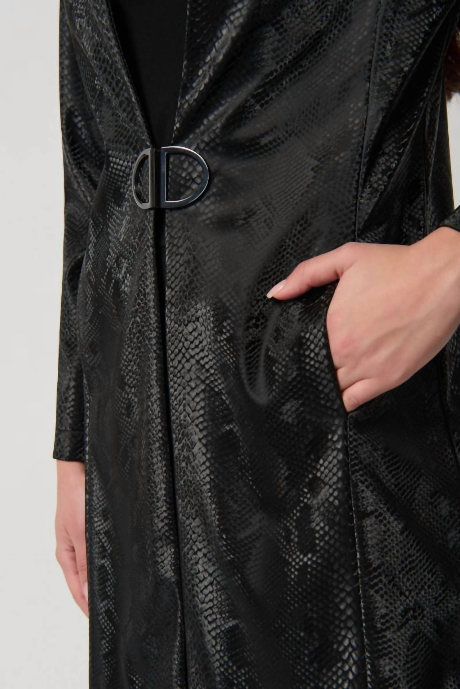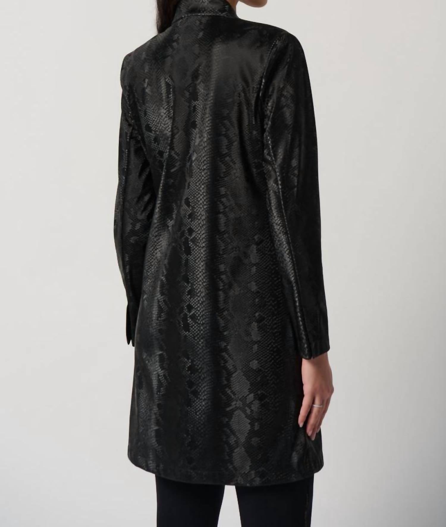 A casual yet cool jacket that every closset needs.With its bold snake leather façade, this exquisite coat commands attention. With its luxurious leatherette material, this A-line coat will keep you warm without compromising comfort or breathability. The gunmetal ornament closure gives this piece an edgy yet sophisticated feel, while the long sleeves and reversed notch collar create a stylish silhouette. Fabric: Faux leather fabric. Composition: 65% Polyurethane, 35% Polyester. Details: Reversed notch collar. Long sleeves. Gunmetal ornament at the front. Unlined. Care: Hand wash in cold water with like colors. Do not bleach. Lay flat to dry in the shade. Do not tumble dry. Do not iron. Do not dry clean. Remove excess water promptly. Remove promptly from water. Wash garment inside out. Size/Fit: A-line silhouette. Model is 5'10'' · Wearing size 6.