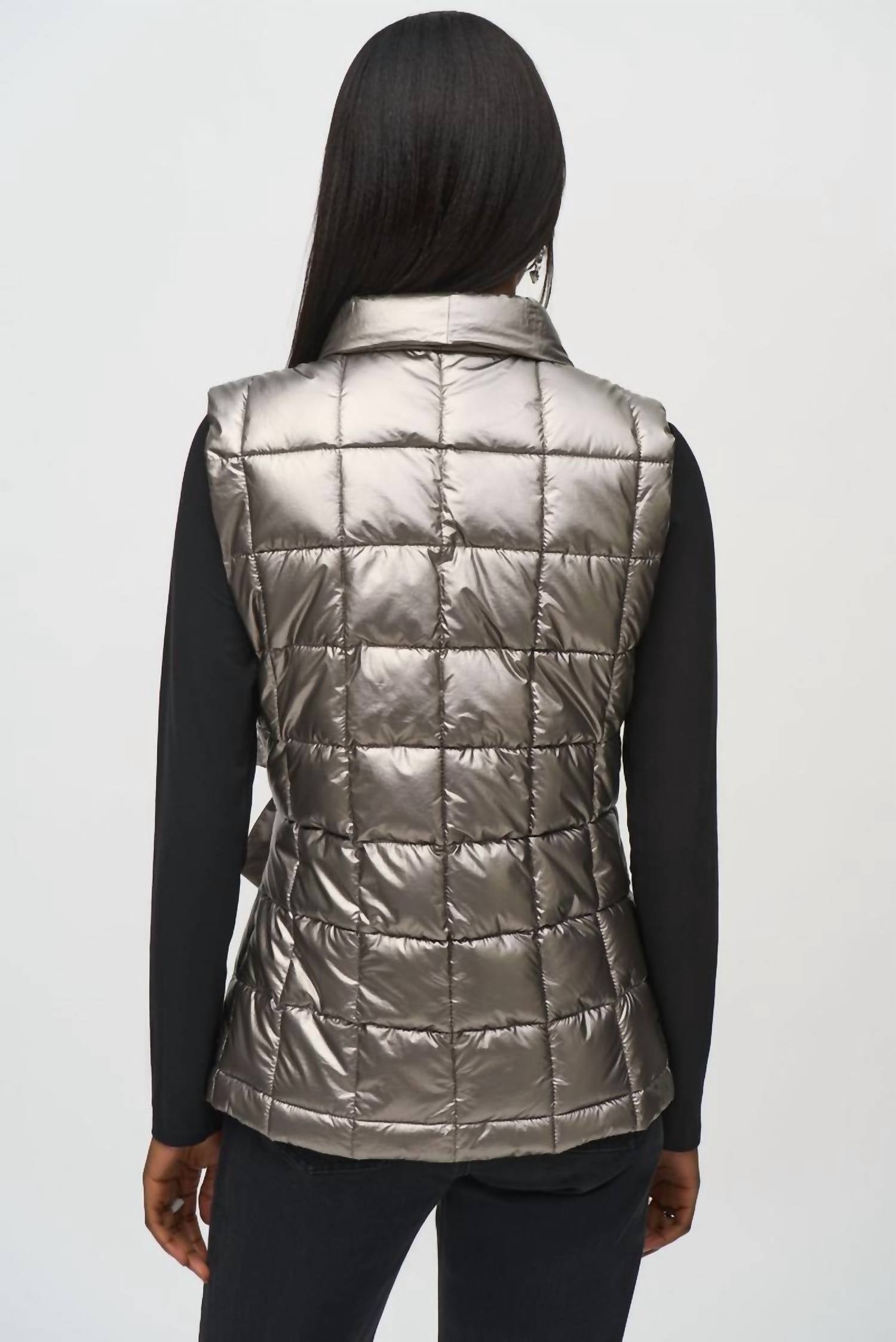 Throw this vest over an all black outfit for a perfectly polished look. Elevate your outerwear collection with the Joseph Ribkoff Quilted Metallic Puffer Vest, an elegant sleeveless addition in striking pewter. Crafted from a blend of 52% Polyurethane and 48% Nylon, this vest is designed with a sophisticated shawl collar and a practical waist belt for a tailored fit. The solid pattern and functional pockets make it both stylish and functional, perfect for the modern woman. Closure: Pull-on. Ideal for adding a shimmering touch to any outfit, this vest is lined for extra comfort.